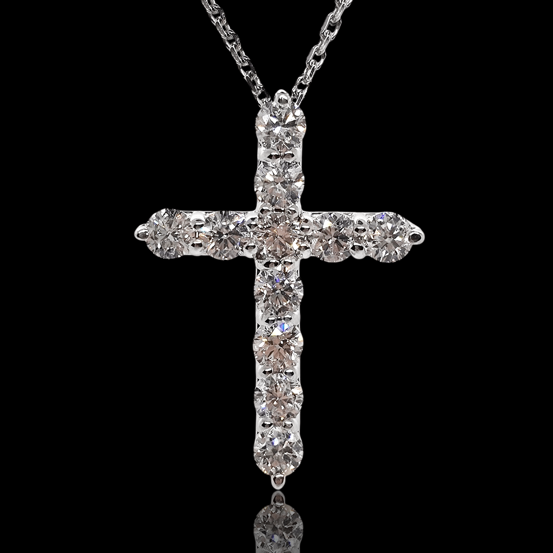 Raudono aukso kryžiukas puoštas 11 vienetų briliantų. Kryžiukas laikosi ant 50cm raudono aukso grandinėlės. Briliantai išdėstyti per visą auksinio kryžiuko plotą. Tai gali būti prasminga dovana svarbiausioms gyvenimo akimirkoms. Dovana puikiai tinka krikštynoms, gimtadieniui, metinių sukaktims ar tiesiog kai norisi šiltai nustebinti artimą žmogų. Turime įvairių dydžių ir aukso spalvų. Apačioje galite matyti kryžiukų dydžių lentele. Šio kryžiuko briliantų skersmuo 3mm