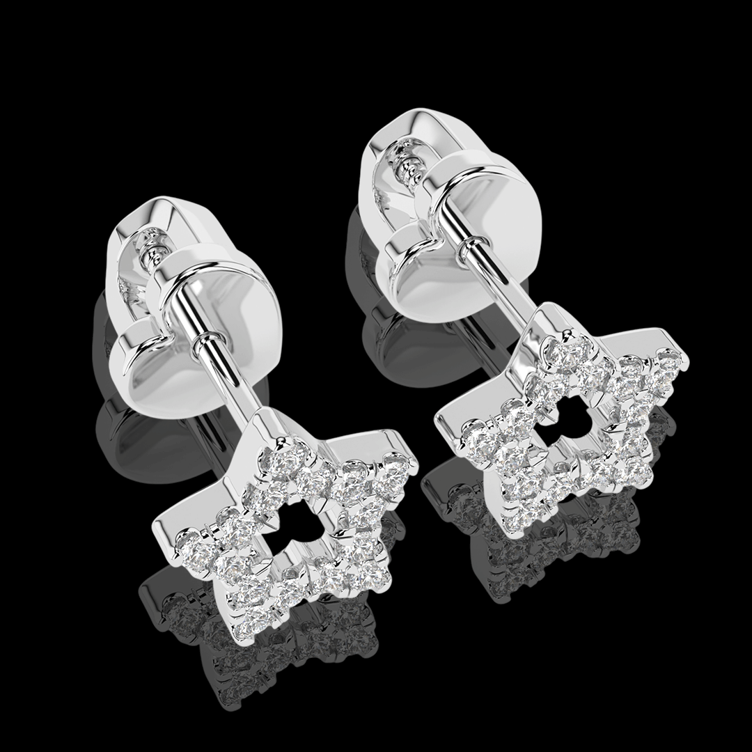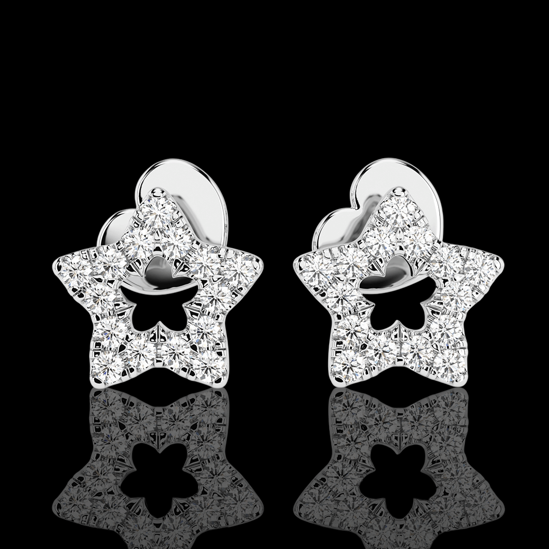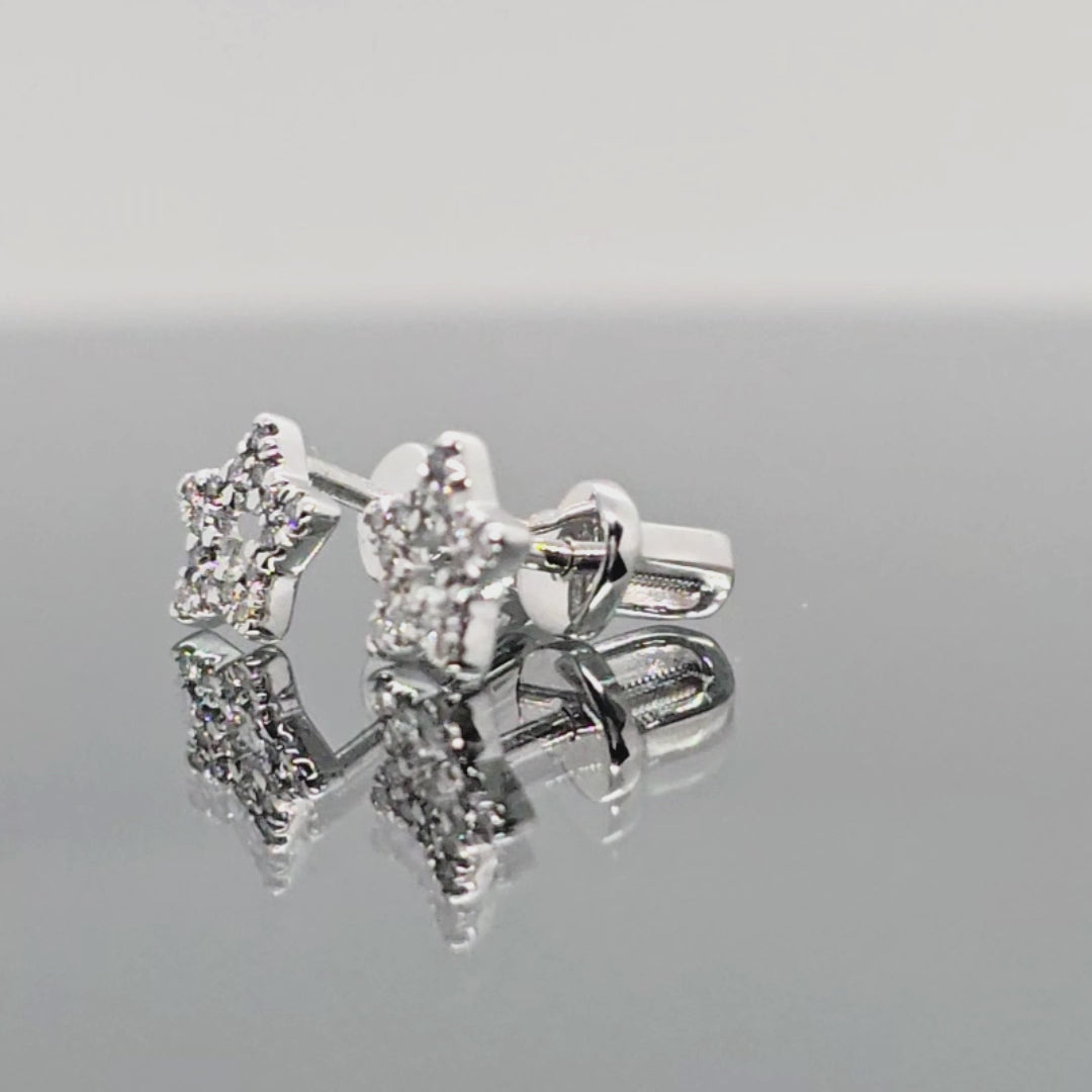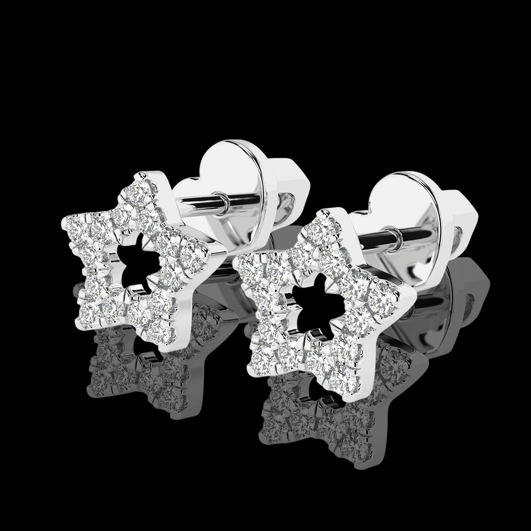 Balto aukso žvaigždutės formos auksiniai auskarai. Auskarų užsegimas – varžtelio tipo, kas suteikia papildomo saugumo ir patogumo juos nešiojant. Šie auskariukai turi 30vnt. mažų natūralių briliantų.