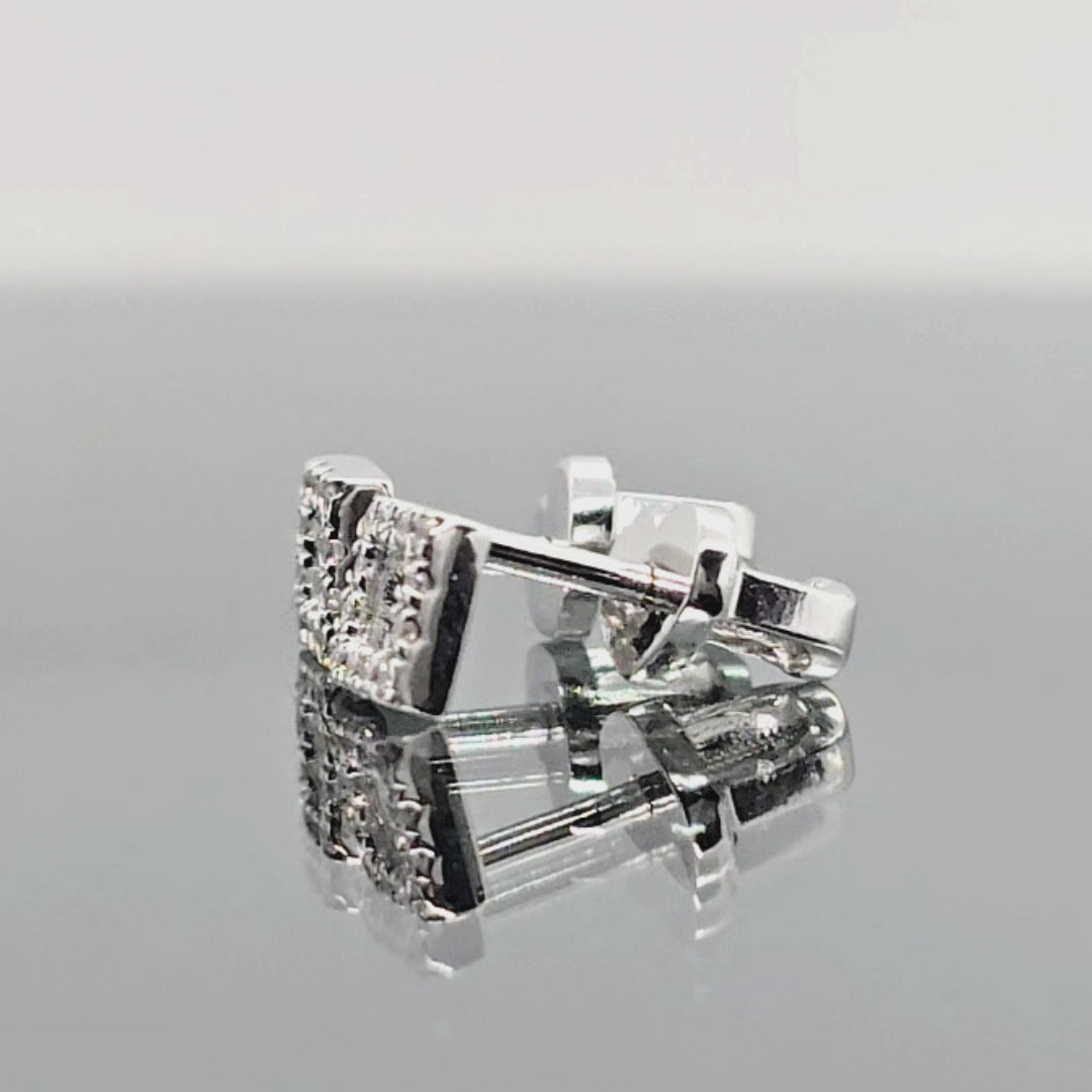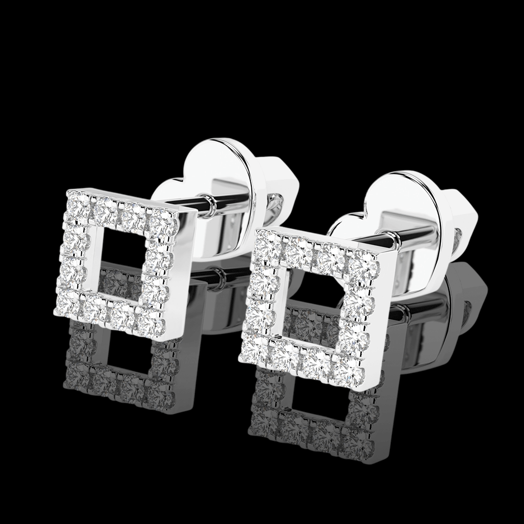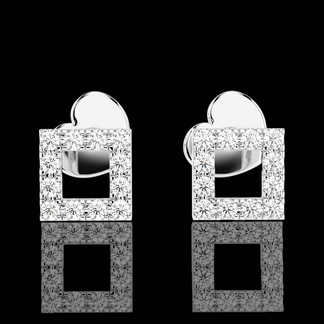 Balto aukso auskarai su deimantais. Šie auskarai kvadrato formos. Auskarų užsegimas – varžtelio tipo, kas suteikia papildomo saugumo ir patogumo juos nešiojant.