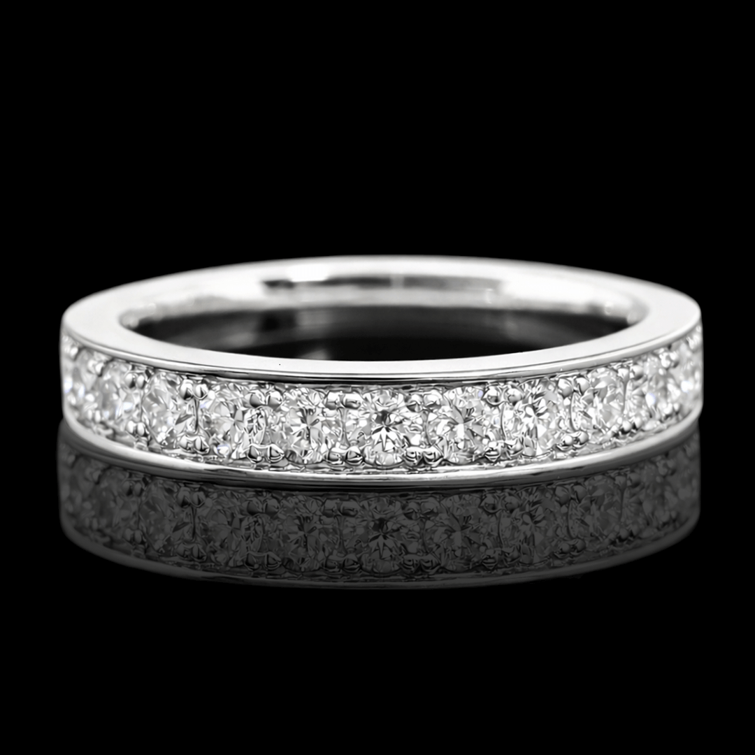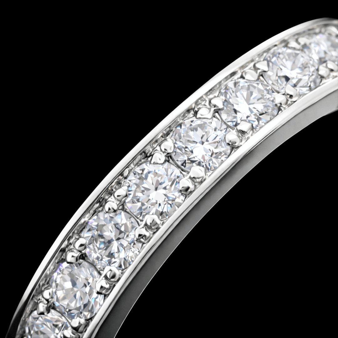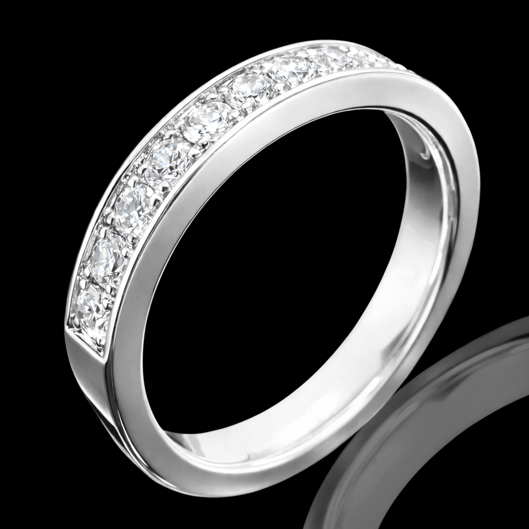 Balto aukso žiedas puoštas ypač skaidriais briliantais. Žiedo priekyje įstatyta 14 vienetų briliantų. Toks briliantų įstatymas leidžia žiedui priglusti prie piršto. Mažo aukščio žiedas patogus tuom, kad jį galimą mažiau saugoti nešiojant ar atliekant kasdienias veiklas. Šį žiedą galime pagaminti pagal jūsų norimą dydį ar aukso spalvą, dėl užsakymo susisiekite privačiai.