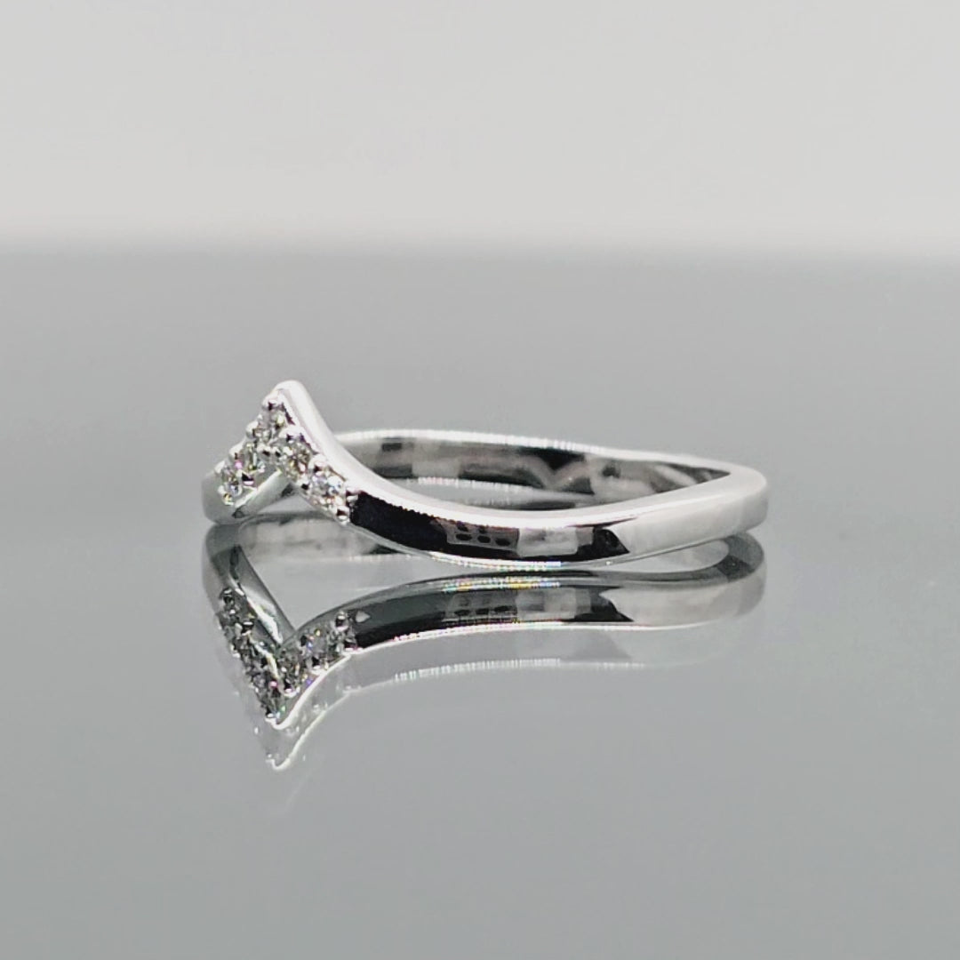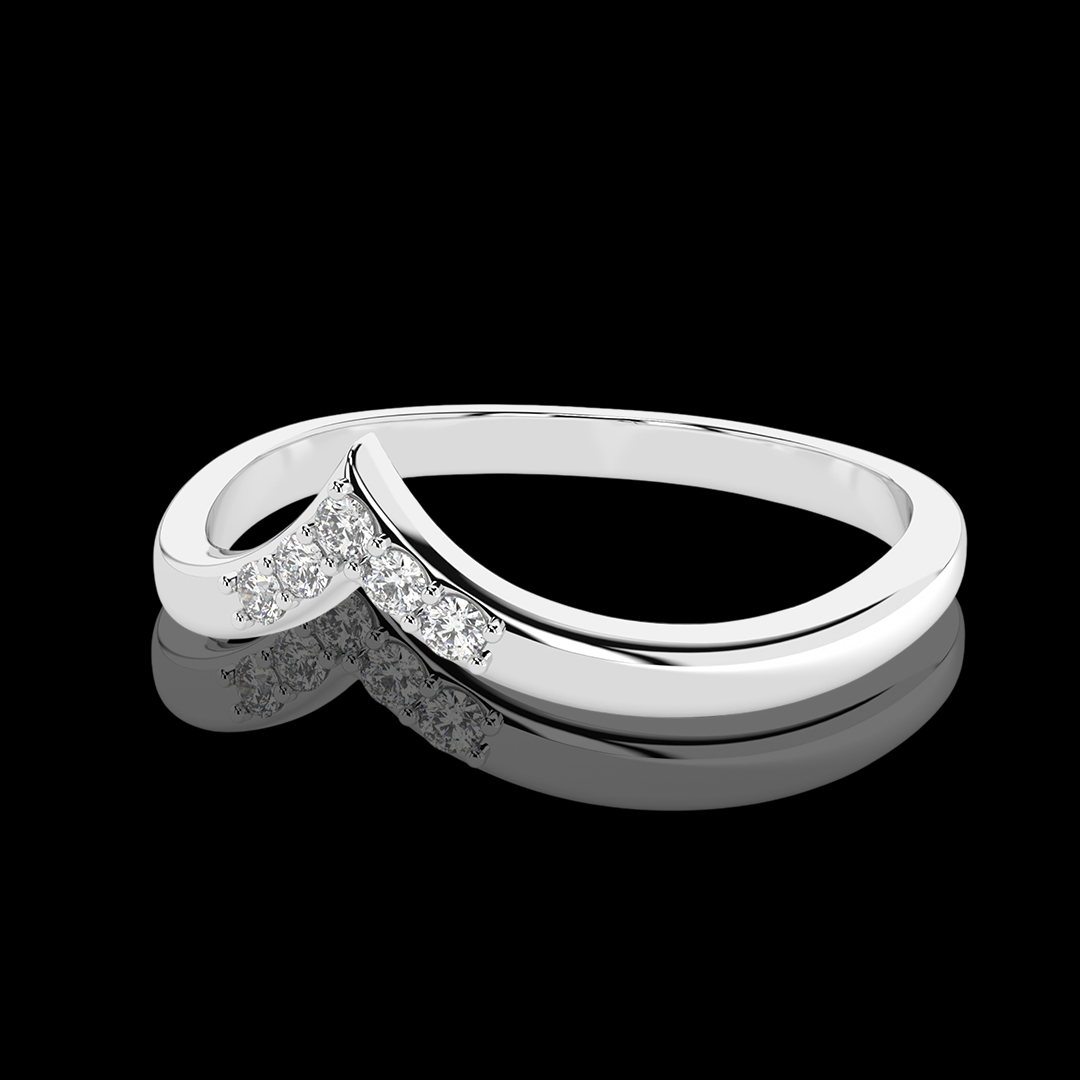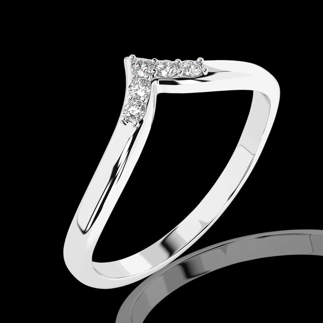Šis balto aukso žiedas su deimantais spindi subtilia elegancija ir šiuolaikišku dizainu. "V" formos lankelis, papuoštas mažais briliantais, išryškina žiedo modernumą. Jis gali būti dėvimas vienas arba derinamas su sužadėtuvių arba vestuviniais žiedais, suteikdamas deriniui originalumo.