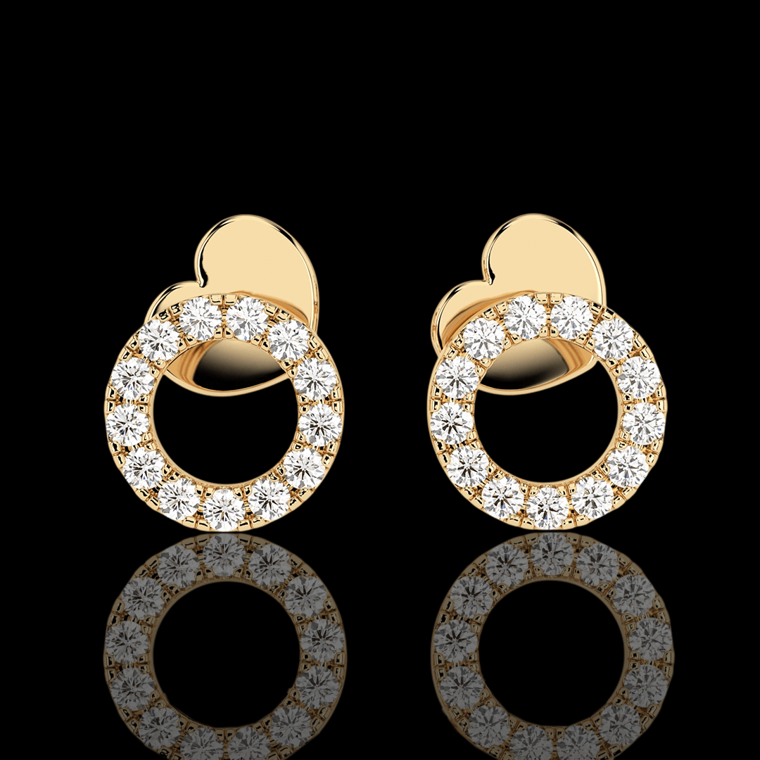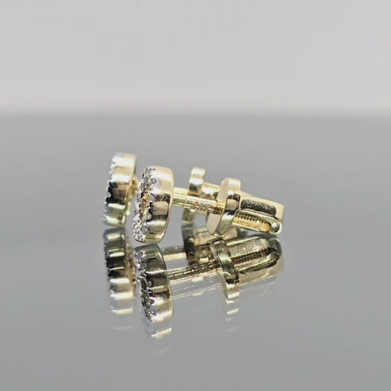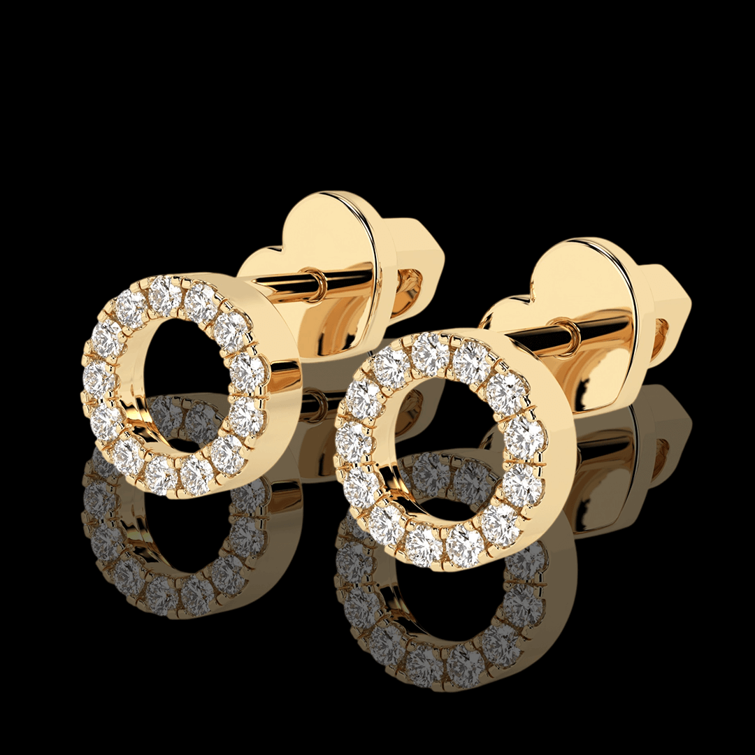 Geltono aukso auskarai su deimantais. Auskarų užsegimas – varžtelio tipo, kas suteikia papildomo saugumo ir patogumo juos nešiojant. Minimalistinis dizainas ir klasikinė apvali forma leidžia deimantams skleistis visu savo žavesiu, suteikdami įvaizdžiui lengvumo bei išskirtinio švytėjimo.
