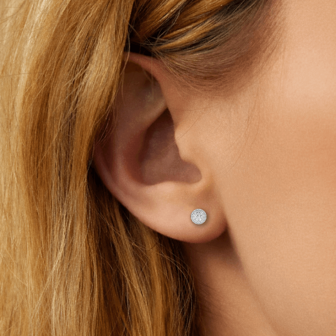 Apvalios formos auskarai, pagaminti iš geltono aukso, dekoruoti daugybe mažų deimantukų. Šie auskarai turi net po 32 vienetus mažų deimantų. Auskarų užsegimas – varžtelio tipo, kas suteikia papildomo saugumo ir patogumo juos nešiojant.