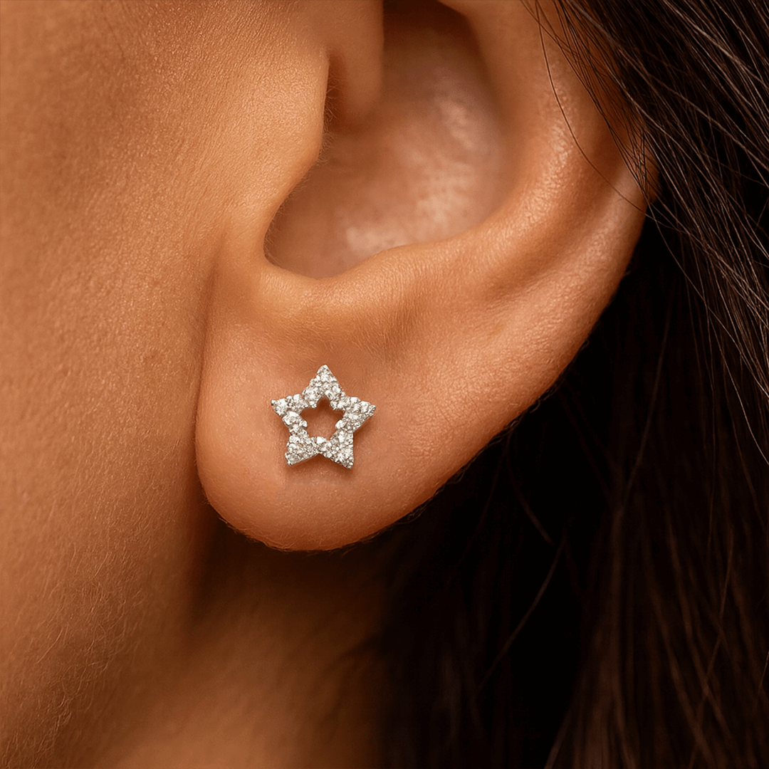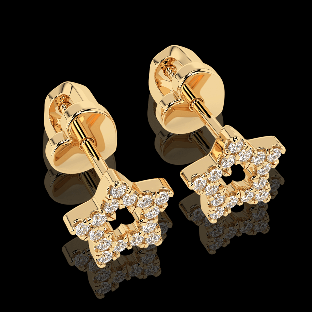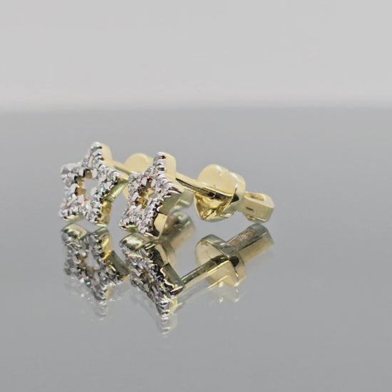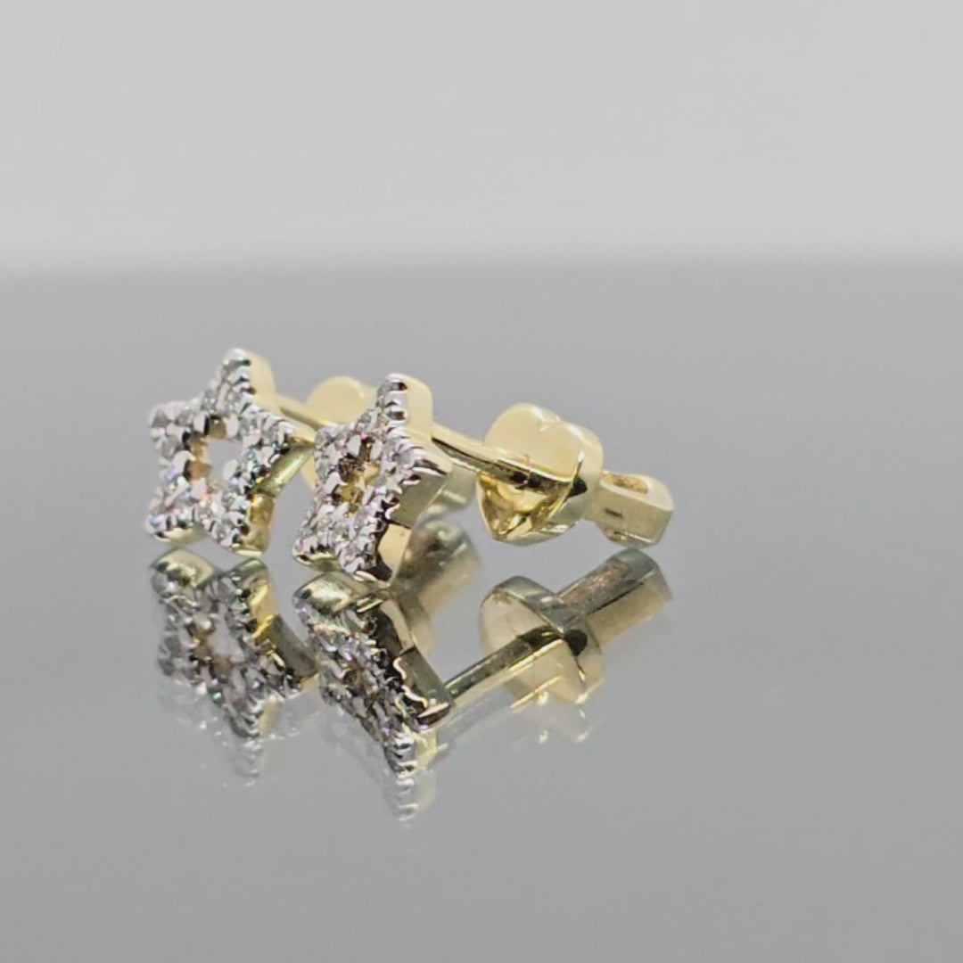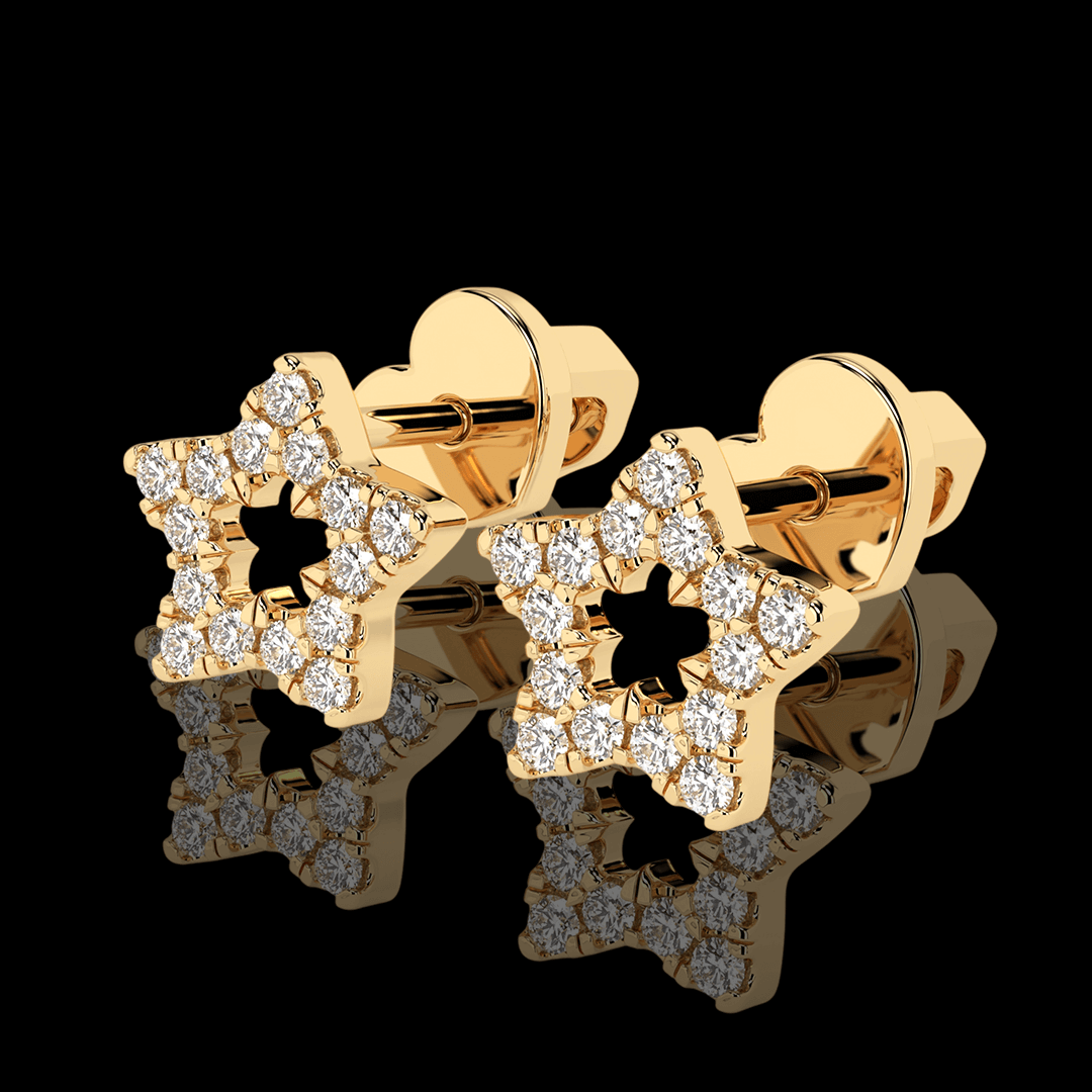 Geltono aukso žvaigždutės formos auksiniai auskarai. Auskarų užsegimas – varžtelio tipo, kas suteikia papildomo saugumo ir patogumo juos nešiojant. Šie auskariukai turi 30vnt. mažų natūralių briliantų.