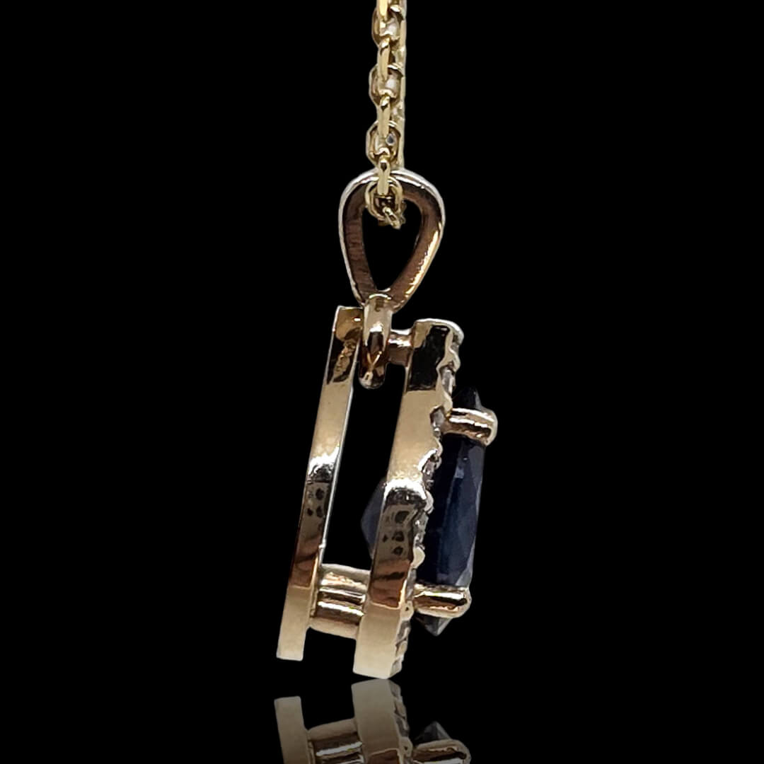 Geltono aukso grandinėlė su pakabuku puoštu briliantais ir safyru. Pakabukas papuoštas su 16vnt. briliantų. Pakabukas laikosi ant 50cm geltono aukso grandinėlės. Apačioje rasite išsamų briliantų aprašymą.