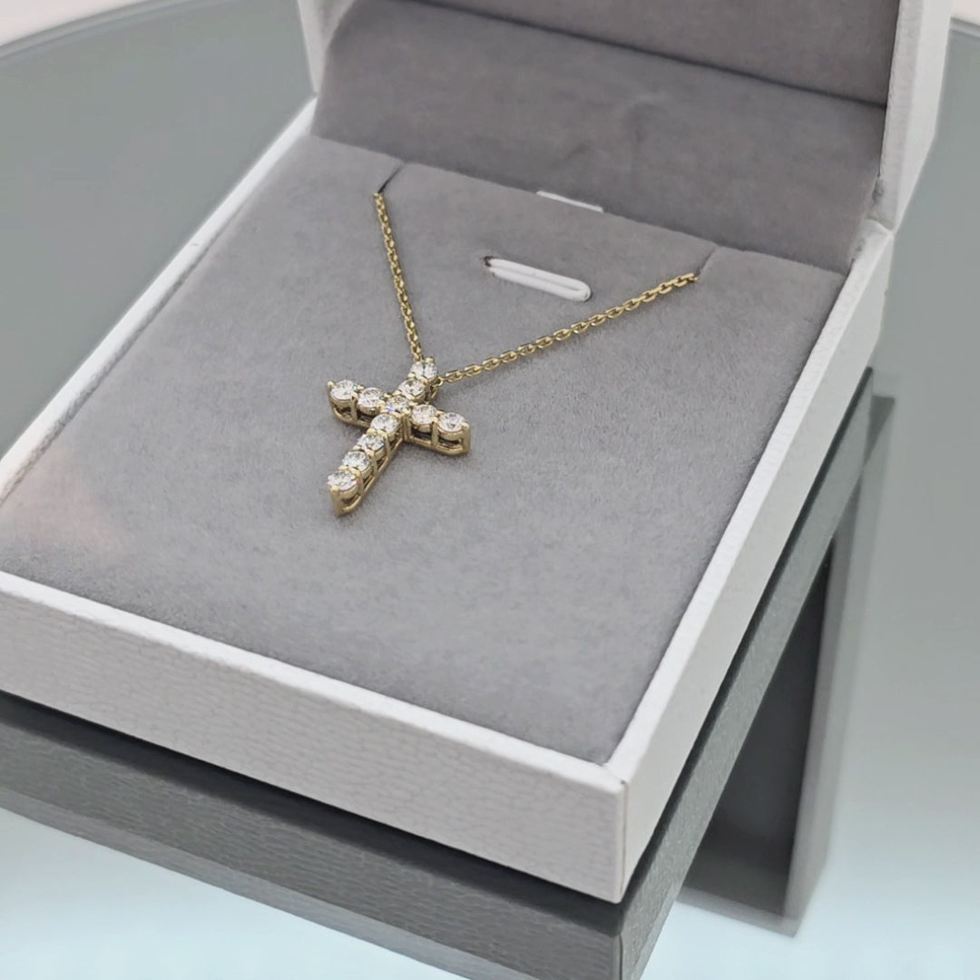 Geltono aukso kryžiukas puoštas 11 vienetų briliantų. Kryžiukas laikosi ant 44cm geltono aukso grandinėlės. Briliantai išdėstyti per visą auksinio kryžiuko plotą. Tai gali būti prasminga dovana svarbiausioms gyvenimo akimirkoms. Dovana puikiai tinka krikštynoms, gimtadieniui, metinių sukaktims ar tiesiog kai norisi šiltai nustebinti artimą žmogų. Turime įvairių dydžių ir aukso spalvų. Apačioje galite matyti kryžiukų dydžių lentele. Šio kryžiuko briliantų skersmuo 2.6mm