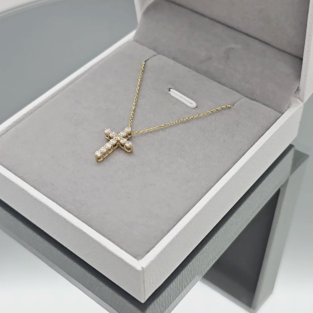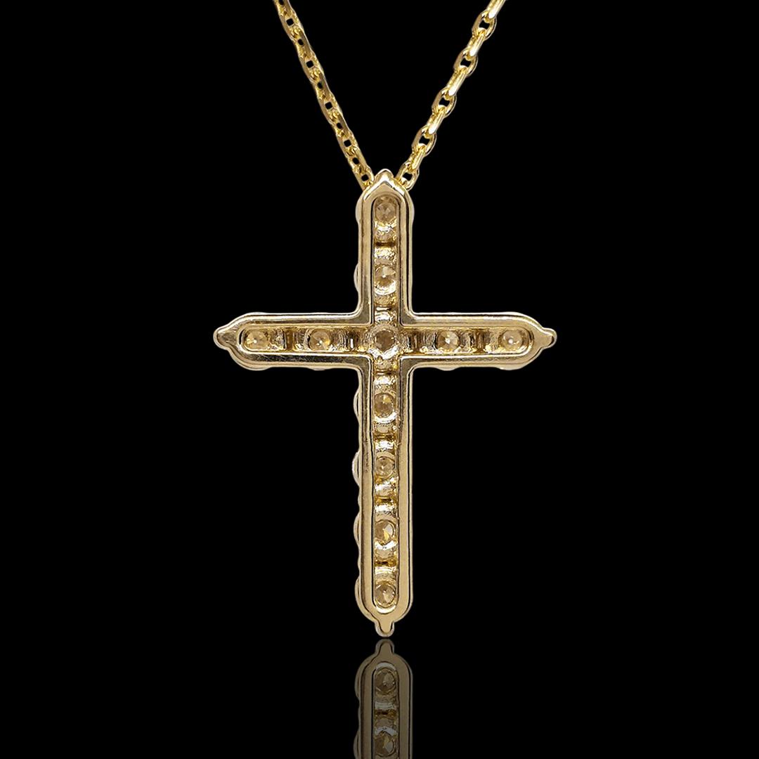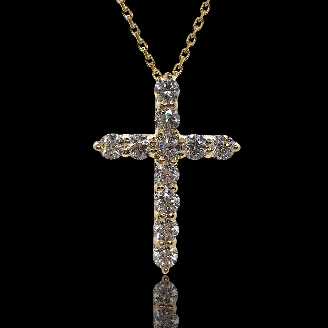 Geltono aukso kryžiukas puoštas 11 vienetų briliantų. Kryžiukas laikosi ant 45cm geltono aukso grandinėlės. Briliantai išdėstyti per visą auksinio kryžiuko plotą. Tai gali būti prasminga dovana svarbiausioms gyvenimo akimirkoms. Dovana puikiai tinka krikštynoms, gimtadieniui, metinių sukaktims ar tiesiog kai norisi šiltai nustebinti artimą žmogų. Turime įvairių dydžių ir aukso spalvų. Apačioje galite matyti kryžiukų dydžių lentele. Šio kryžiuko briliantų skersmuo 2mm