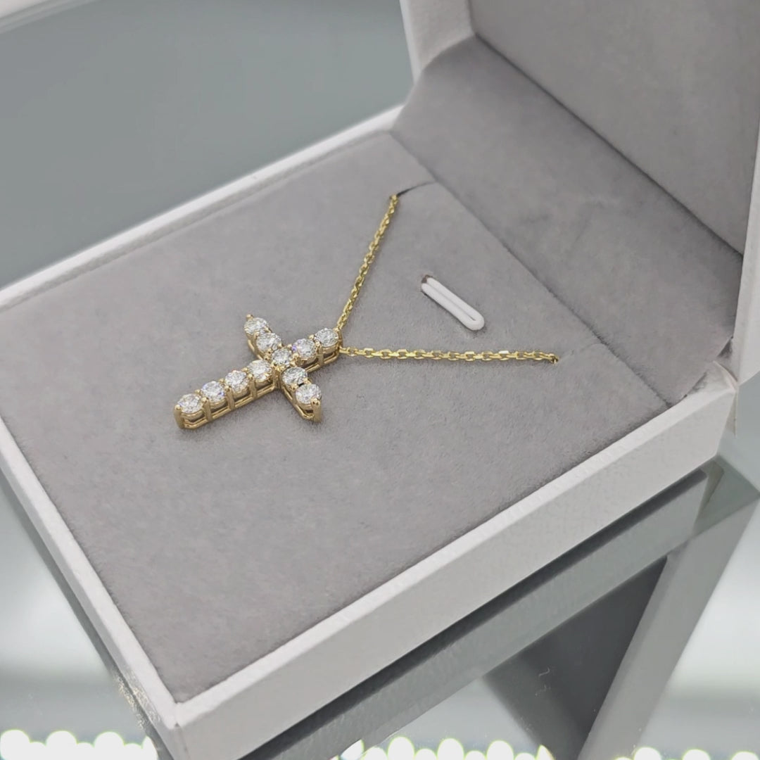 Raudono aukso kryžiukas puoštas 11 vienetų briliantų. Kryžiukas laikosi ant 50cm raudono aukso grandinėlės. Briliantai išdėstyti per visą auksinio kryžiuko plotą. Tai gali būti prasminga dovana svarbiausioms gyvenimo akimirkoms. Dovana puikiai tinka krikštynoms, gimtadieniui, metinių sukaktims ar tiesiog kai norisi šiltai nustebinti artimą žmogų. Turime įvairių dydžių ir aukso spalvų. Apačioje galite matyti kryžiukų dydžių lentele. Šio kryžiuko briliantų skersmuo 3mm