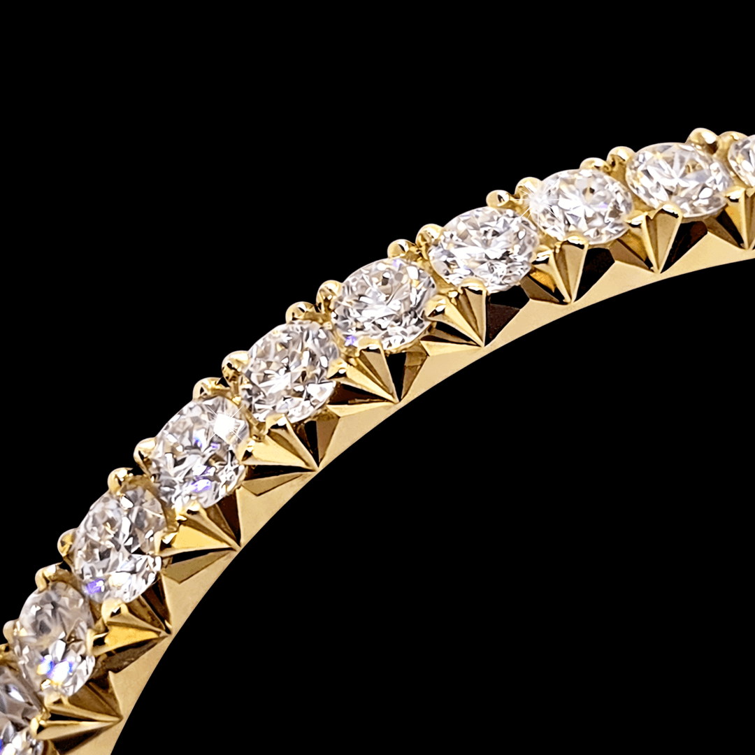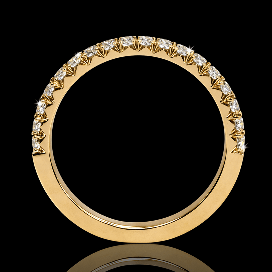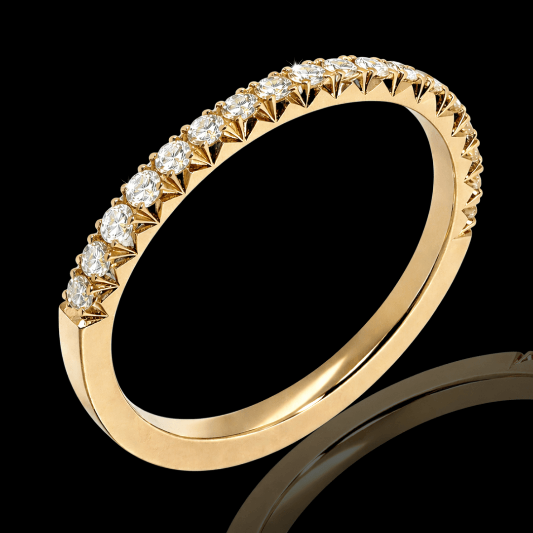 Geltono aukso žiedas "Fishtail". Dizainas pasižymi tuo, kad kiekvienas deimantas įtvirtinamas tarp metalo „dantukų“, kurie yra išpjauti į trikampio formos įpjovas. Leidžia maksimaliai išryškinti deimantų spindesį, nes leidžia šviesai patekti iš daugiau kampų. Tai elegantiškas ir dekoratyvus deimantų tvirtinimo būdas, kuris dažniausiai naudojamas žieduose. Pagaminsime Jums norimo dydžio ir aukso spalvos.