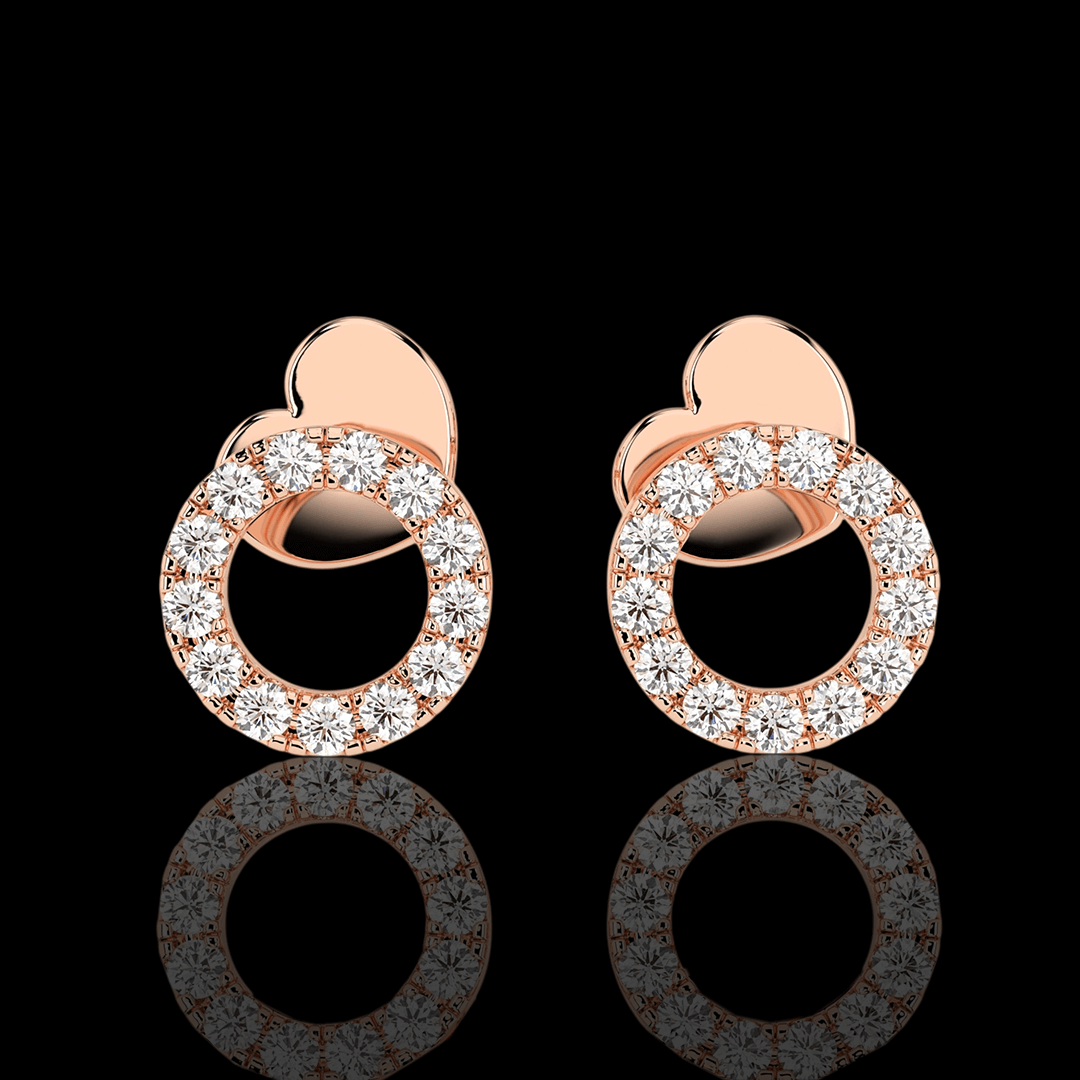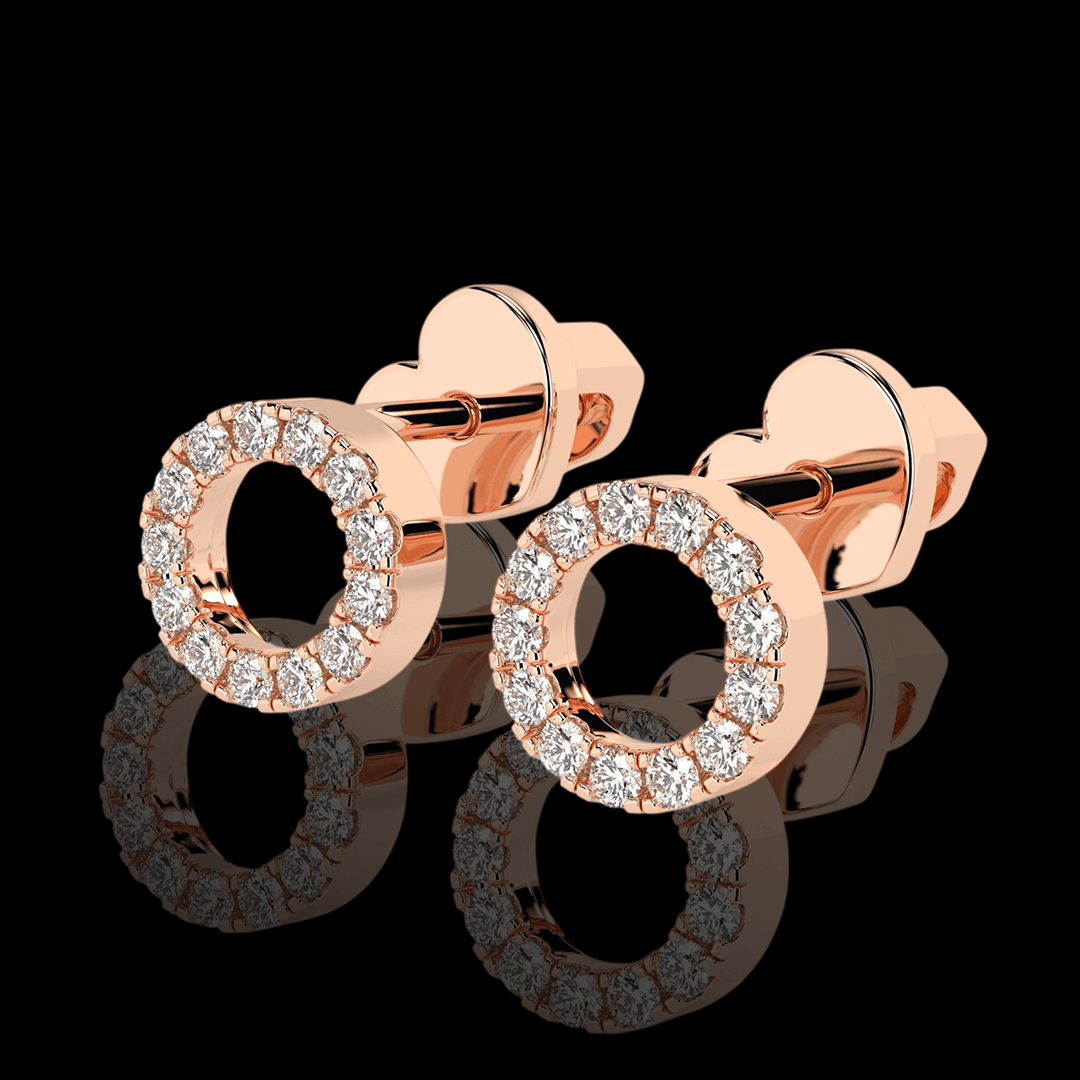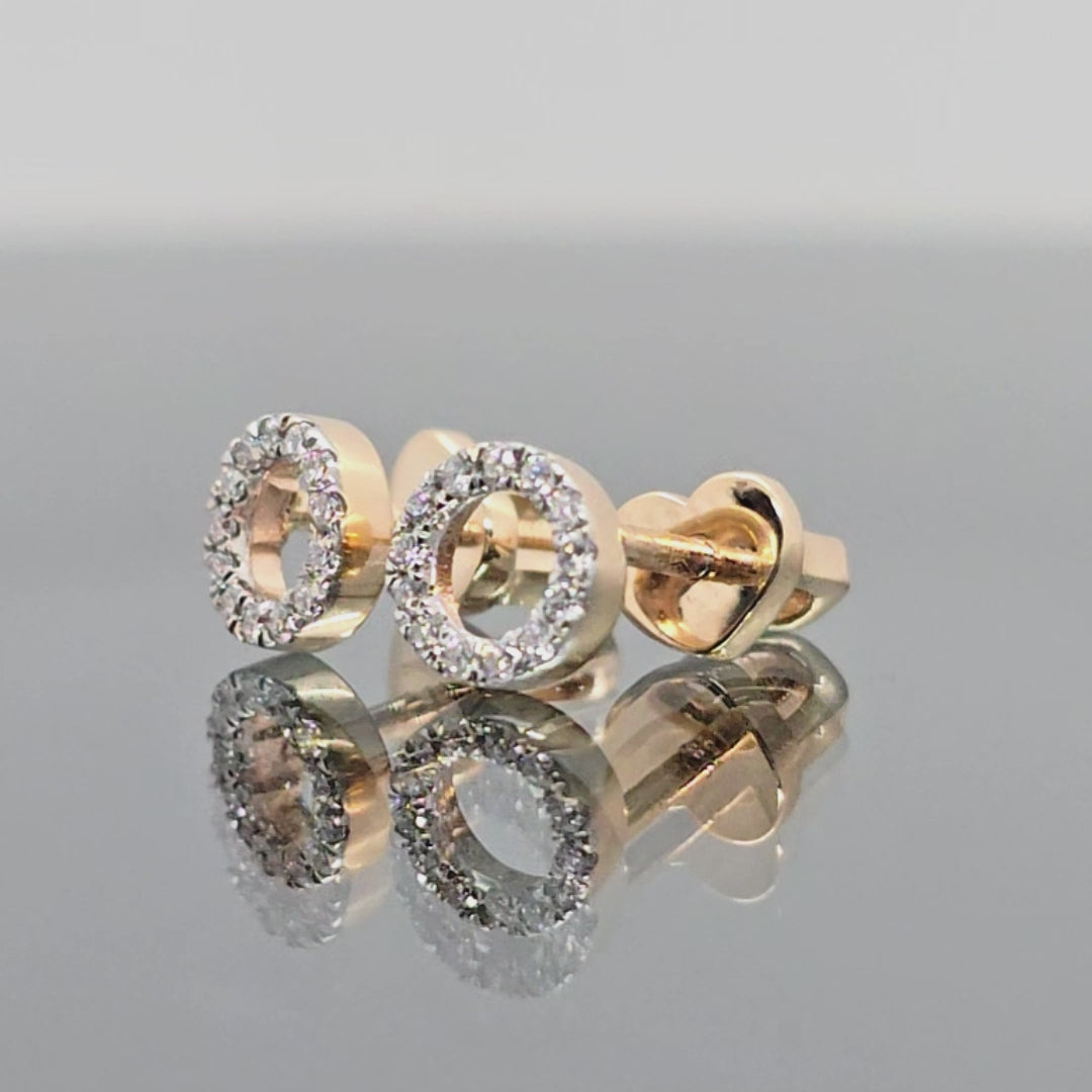 Raudono aukso auskarai su deimantais. Auskarų užsegimas – varžtelio tipo, kas suteikia papildomo saugumo ir patogumo juos nešiojant. Minimalistinis dizainas ir klasikinė apvali forma leidžia deimantams skleistis visu savo žavesiu, suteikdami įvaizdžiui lengvumo bei išskirtinio švytėjimo.