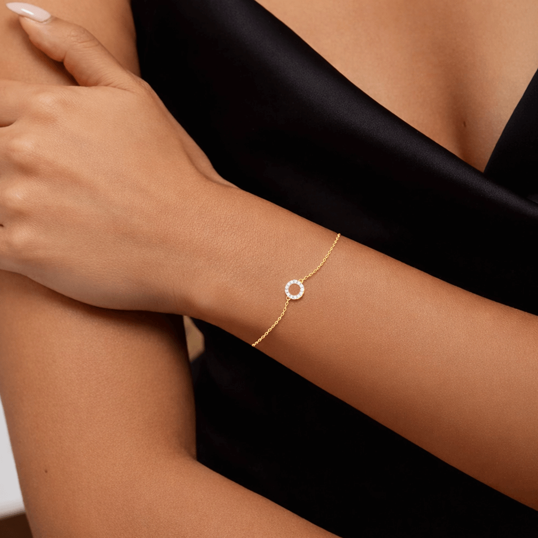 Raudono aukso apyrankė su pakabuku. Pakabukas yra apskritimo formos – centras tuščiaviduris. Pakabukas inkrustuotas smulkiais, spindinčiais natūraliais deimantais. Turime įvairių aukso spalvų.