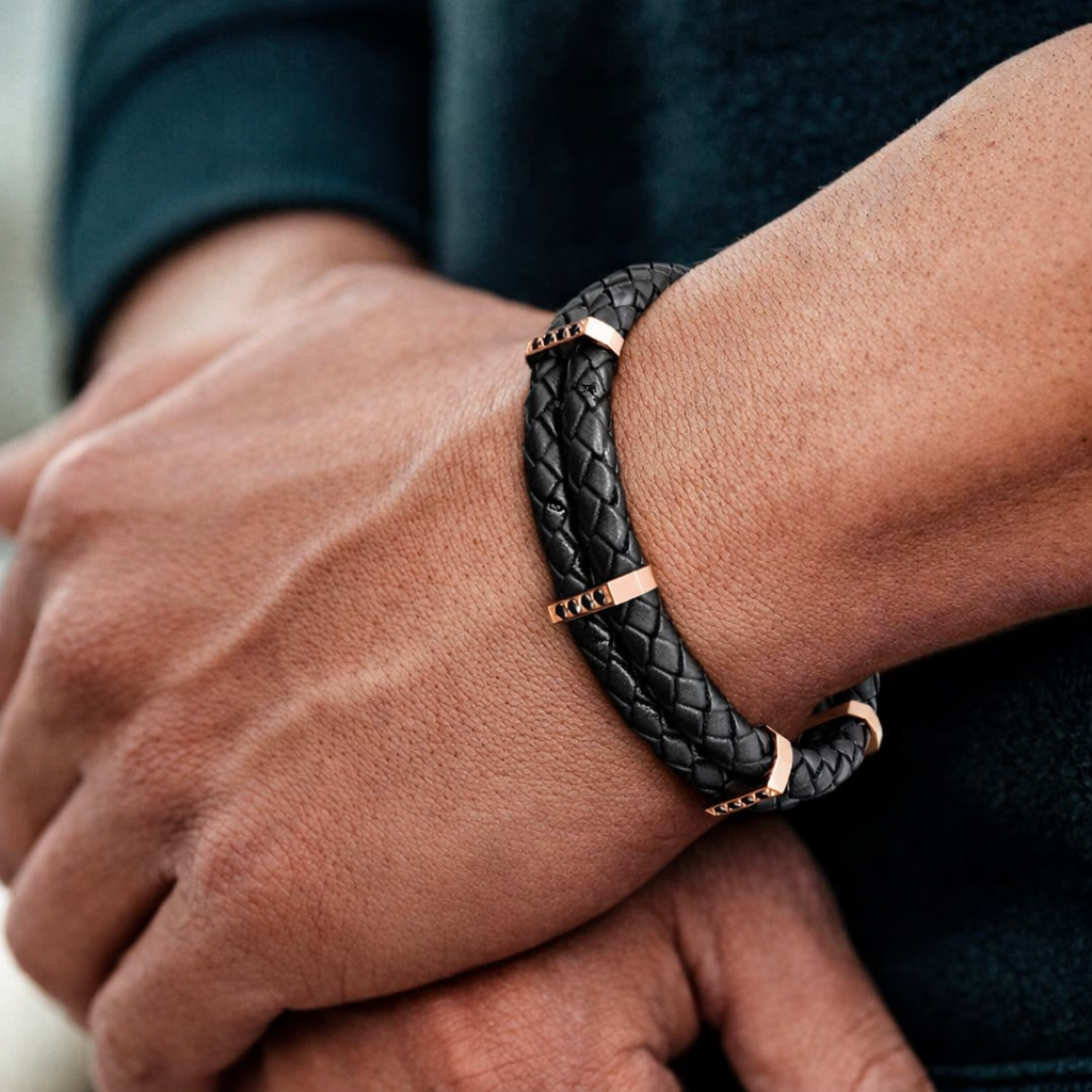 Odinė apyrankė puošta juodais deimantais. Raudono aukso apyranke puošia 5-ios auksinės detalės ir auksinis užsegimas. Ant kiekvienos detalės priekio įstatyti 4 vienetai juodų deimantų. Užsegimas yra patogus, lengvai atsegamas. Užsegimo viduje yra megnetukas kuris leidžia saugiai nešioti apyranke. Galime pagaminti pagal jūsų norimą dydį ar aukso spalvą, dėl užsakymo susisiekite privačiai.