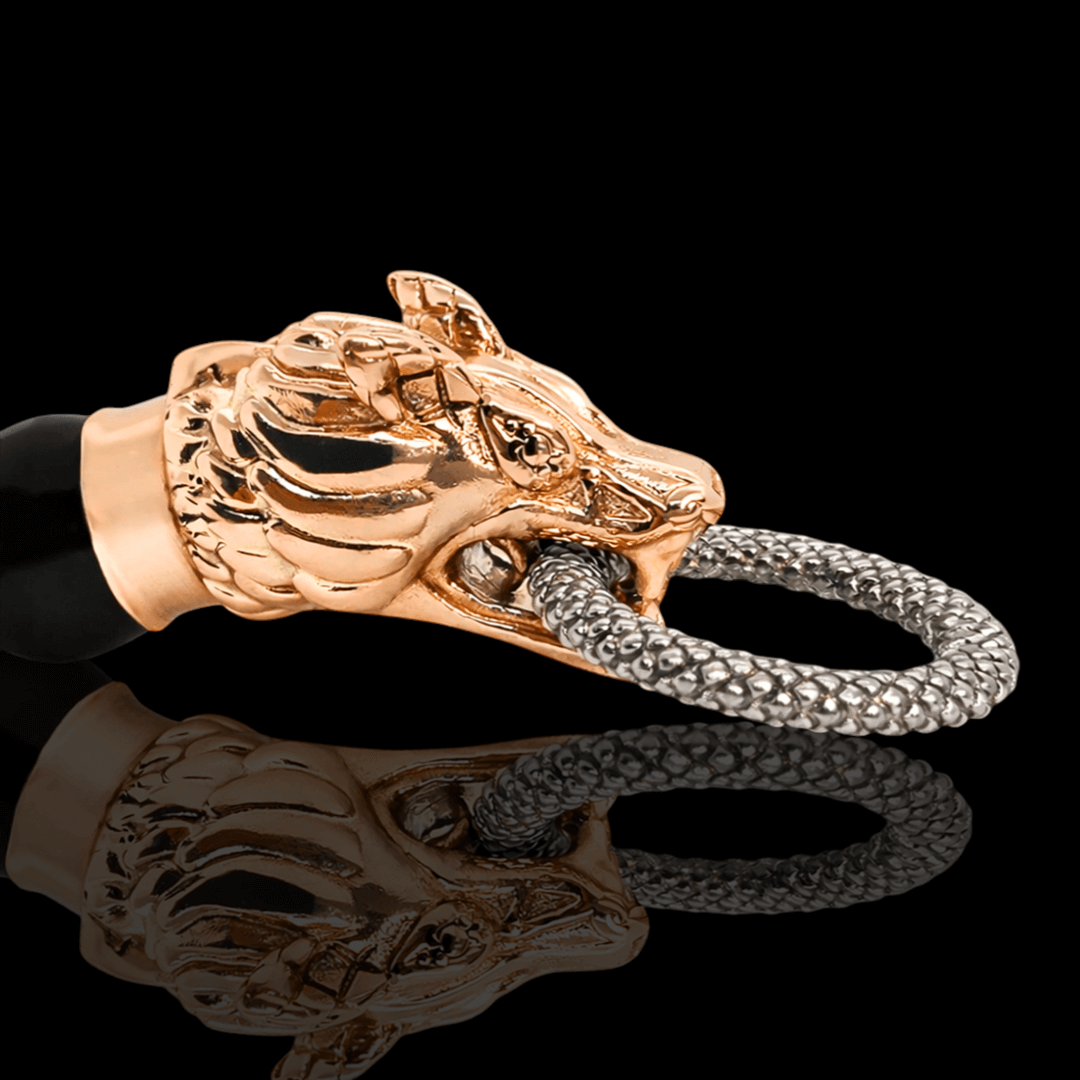 Auksinė apyrankė pagaminta iš raudono aukso karoliukų. Apyranke sudaryta iš dešimt onikso karoliukų ir devynių raudono 585 prabos auksinių karoliukų. Kiekvienas auksinis karoliukas yra puoštas su ornamentais. Didžiausią išskirtinumą sukelia apyrankės užsegimas. Kaip matomą nuotraukoje užsegimas yra detali vilko galva. Užsegimo ratukas yra pagamintas iš balto aukso tai suteikia apyrankei kontrasto. Apyrankė turi dvigubą saugų užsegimą. Esant poreikiui apyrankę galime pagaminti iš kitokios aukso spalvos.