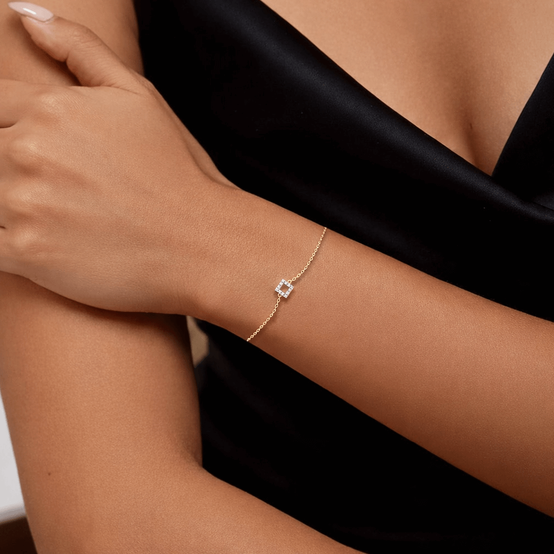 Raudono aukso apyrankė su pakabuku. Pakabukas yra kvadrato formos – centras tuščiaviduris. Pakabukas inkrustuotas smulkiais, spindinčiais natūraliais deimantais. Turime įvairių aukso spalvų.
