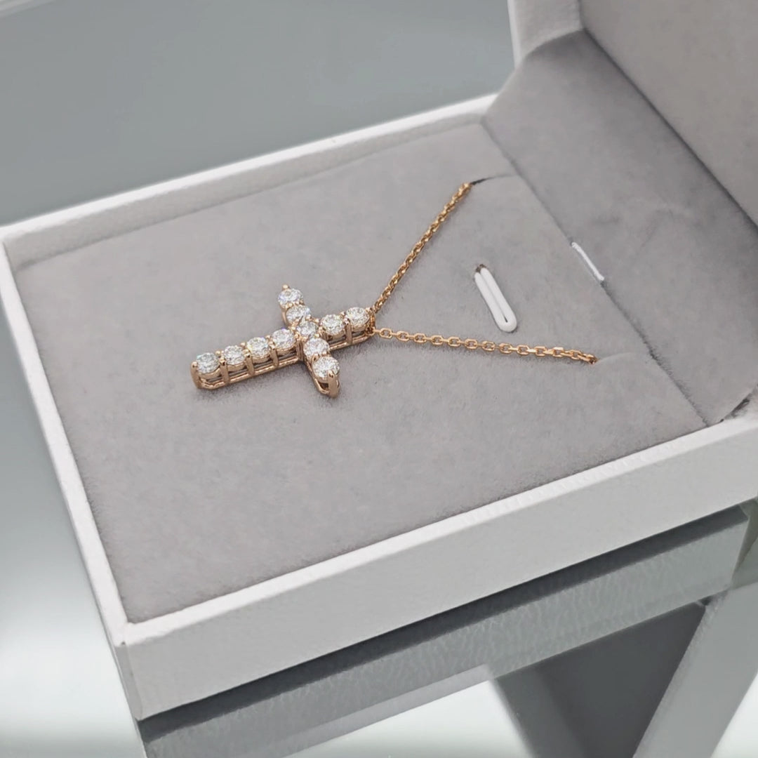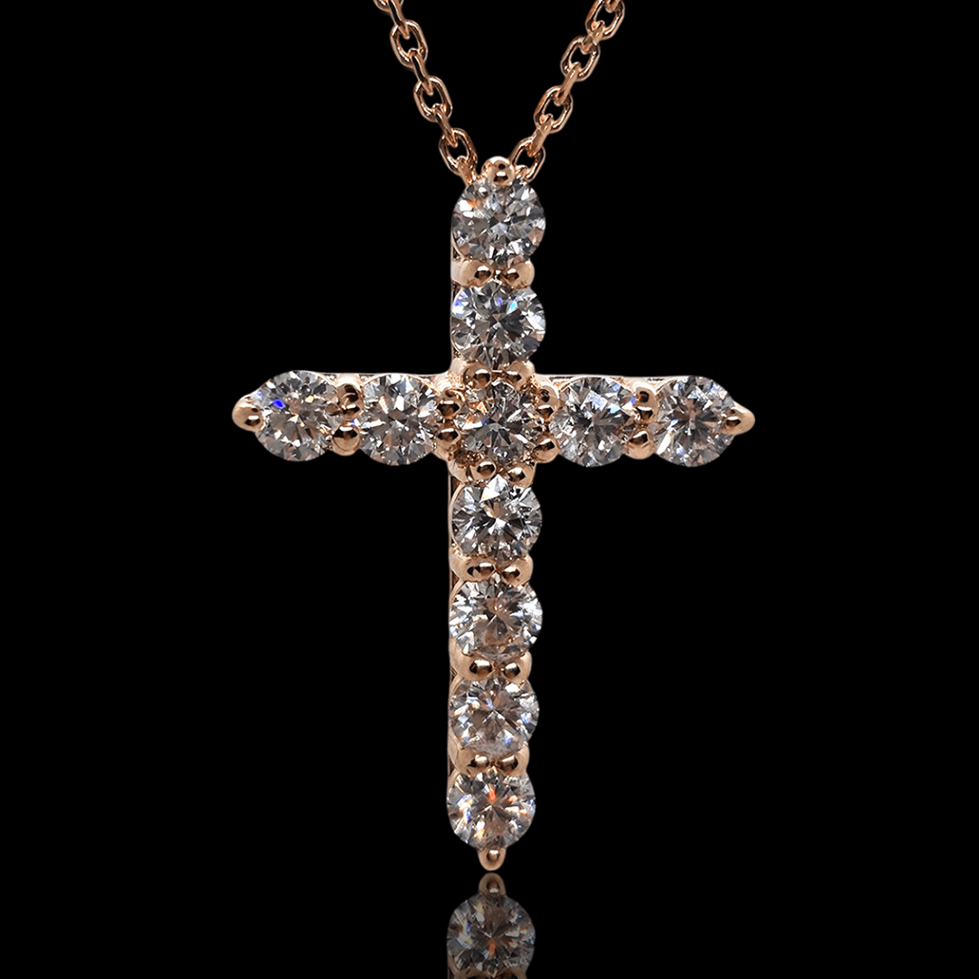 Raudono aukso kryžiukas puoštas 11 vienetų briliantų. Kryžiukas laikosi ant 50cm raudono aukso grandinėlės. Briliantai išdėstyti per visą auksinio kryžiuko plotą. Tai gali būti prasminga dovana svarbiausioms gyvenimo akimirkoms. Dovana puikiai tinka krikštynoms, gimtadieniui, metinių sukaktims ar tiesiog kai norisi šiltai nustebinti artimą žmogų. Turime įvairių dydžių ir aukso spalvų. Apačioje galite matyti kryžiukų dydžių lentele. Šio kryžiuko briliantų skersmuo 3mm