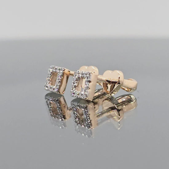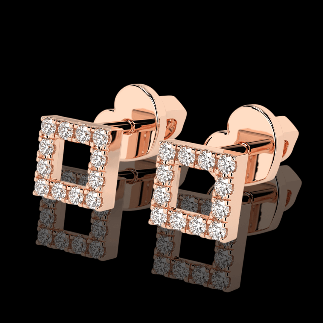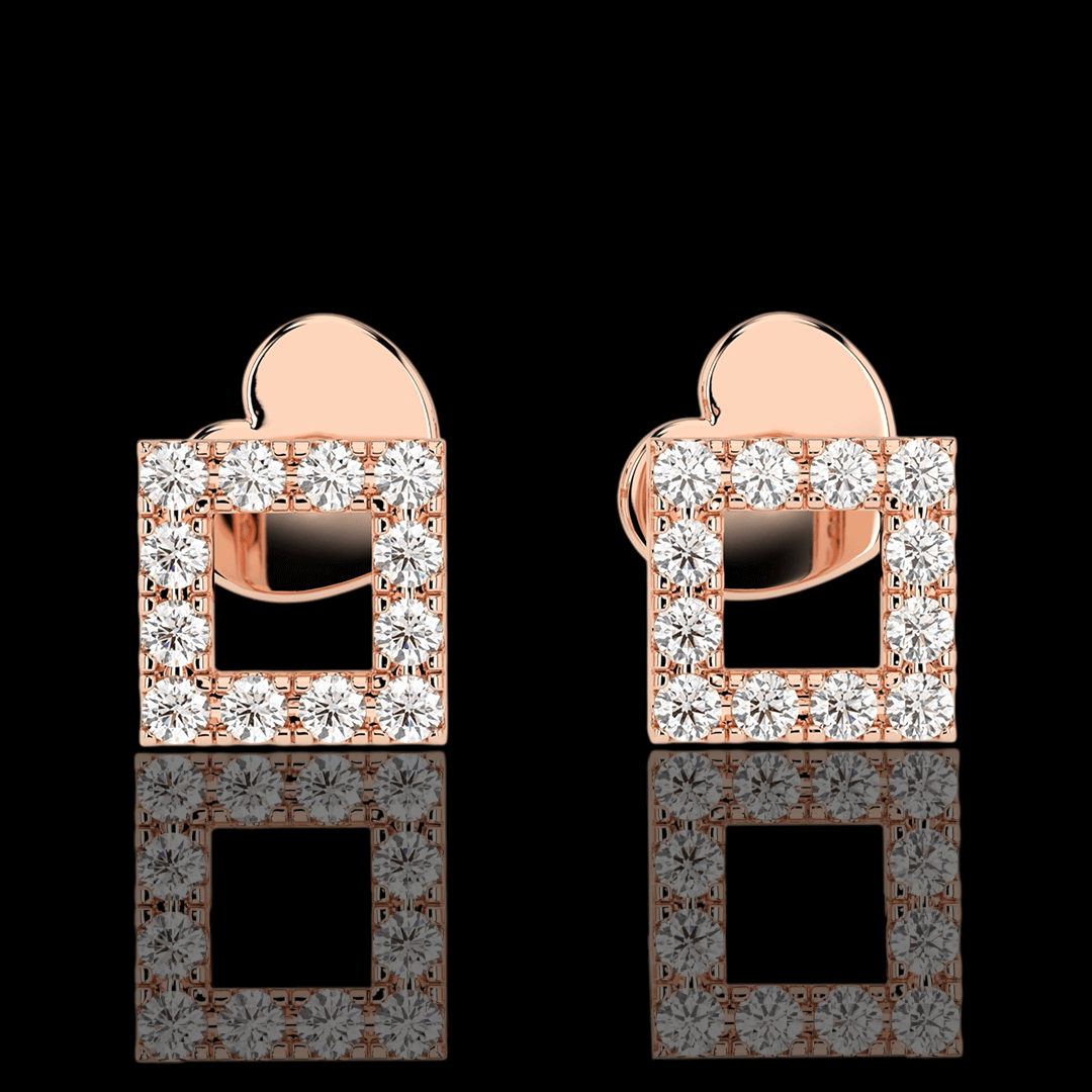 Raudono aukso auskarai su deimantais. Šie auskarai kvadrato formos. Auskarų užsegimas – varžtelio tipo, kas suteikia papildomo saugumo ir patogumo juos nešiojant.