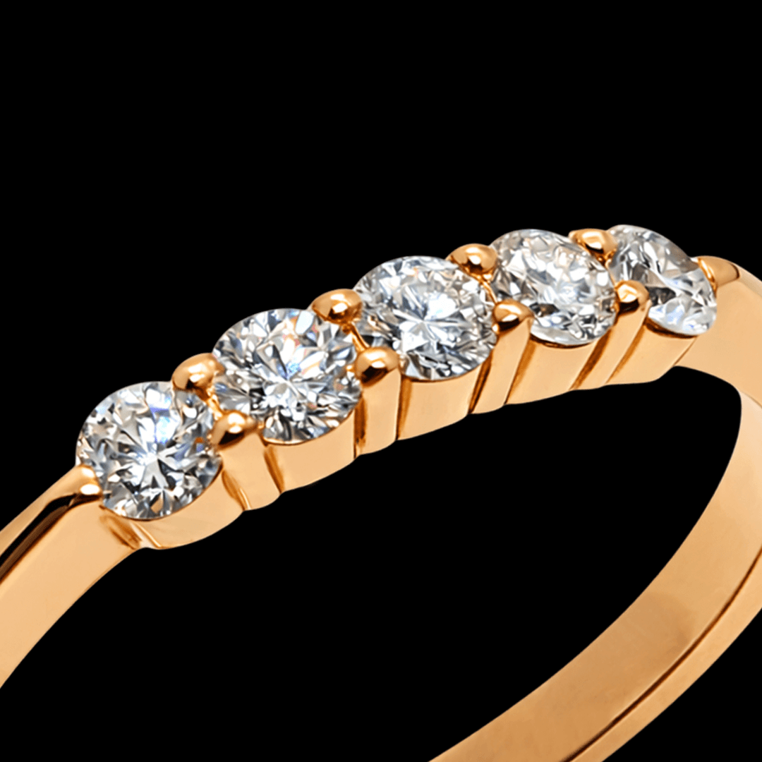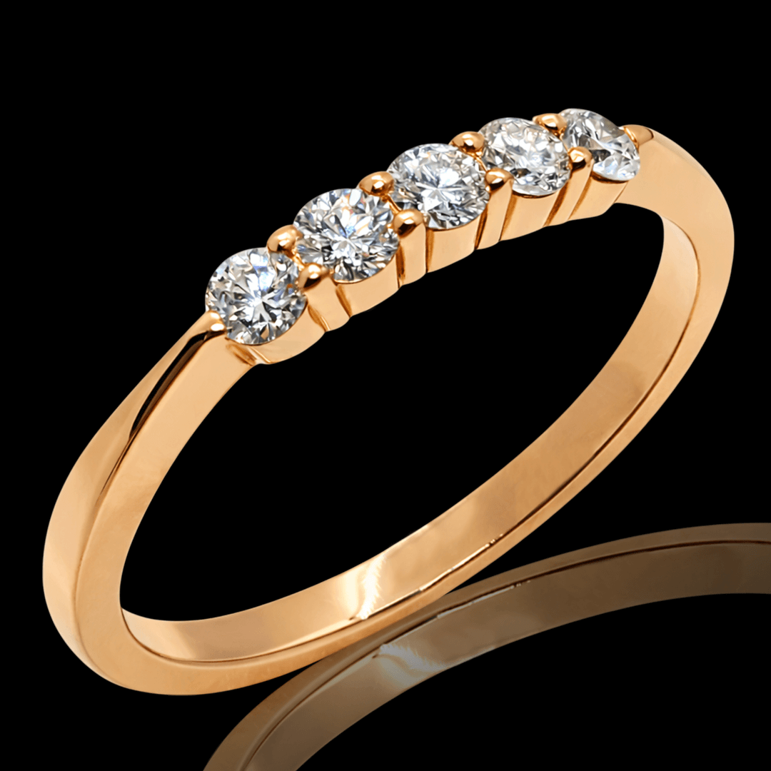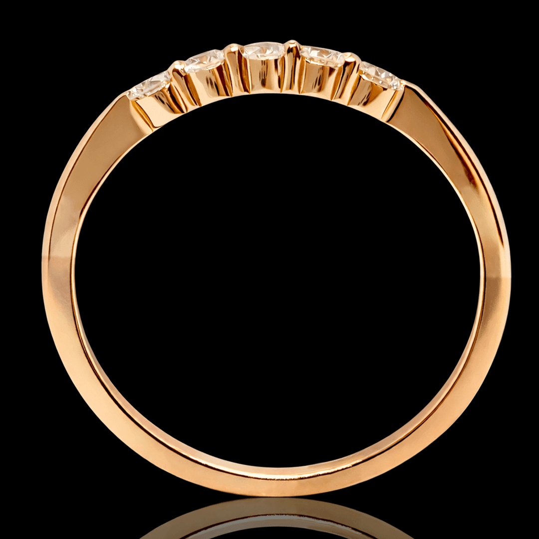 Raudono aukso žiedas puoštas 5 vienetais briliantų. Šis žiedas yra idealus pasirinkimas vertinantiems nesenstančią klasiką ir kokybę.