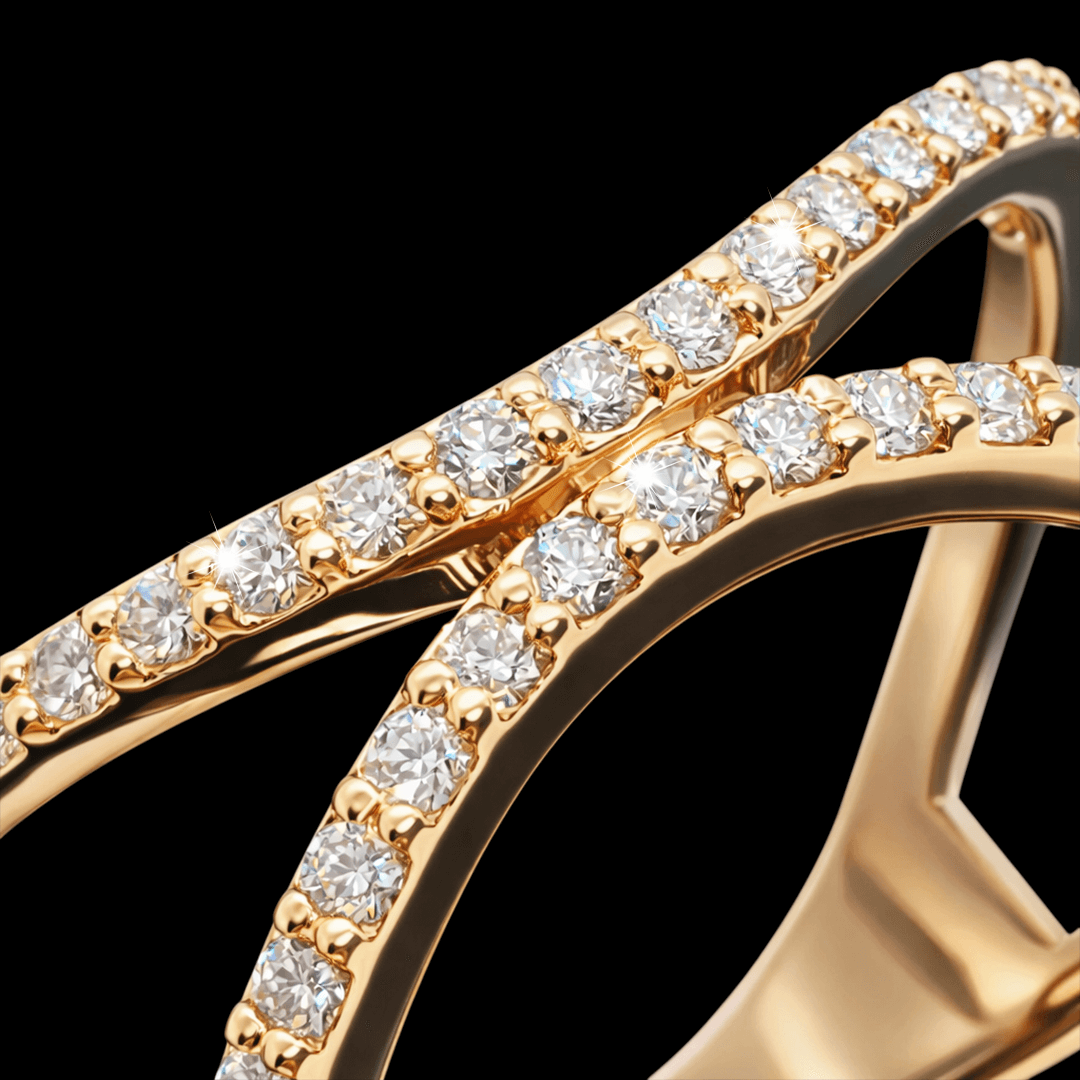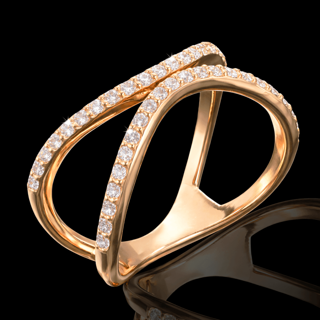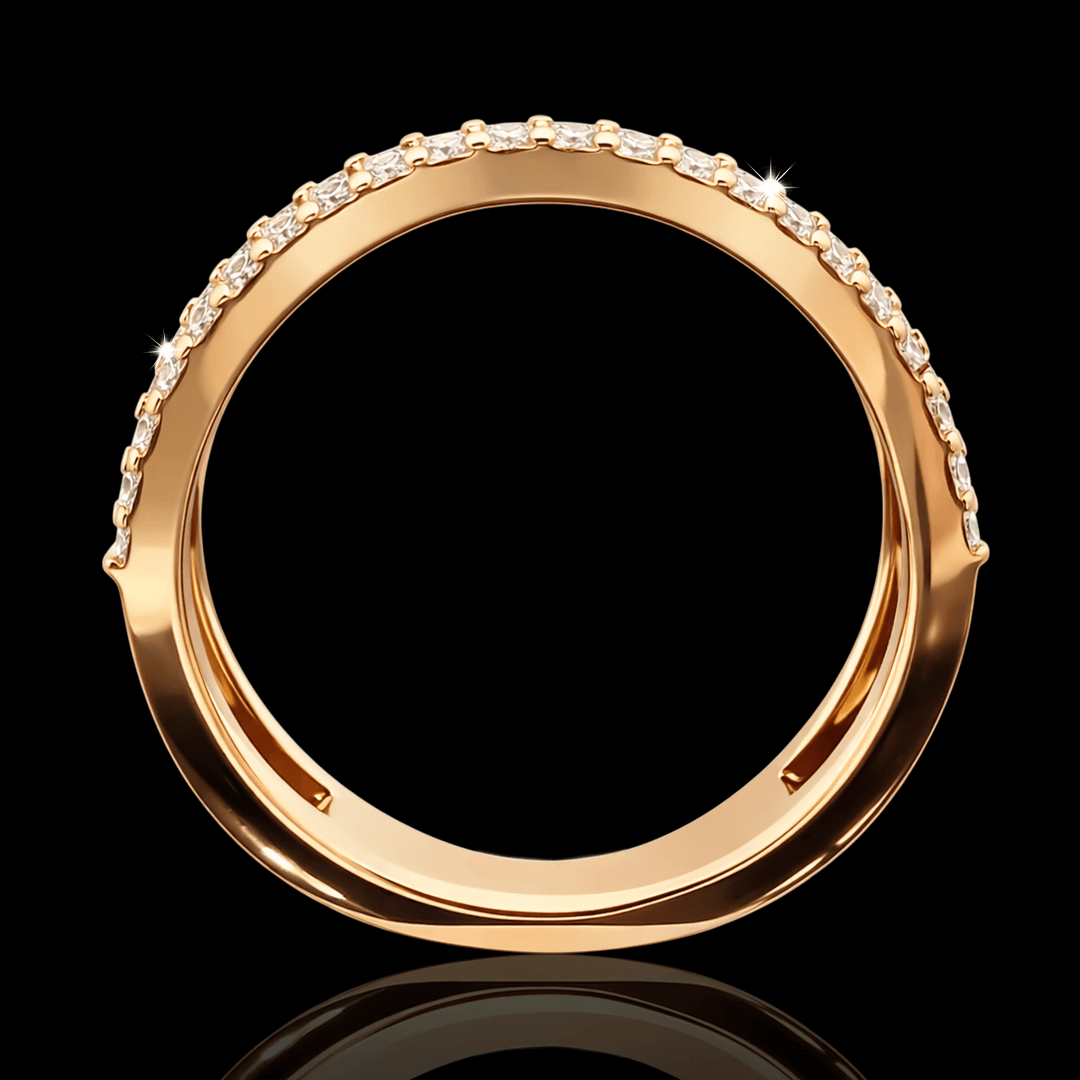 Raudono aukso žiedas su briliantinėm juostelem. Šį žiedą puošia 42 vienetai ypač skaidrių briliantų. Pats žiedas priglunda prie piršto. Ir atrodo šiuolaikiškai ir moderniai. Žiedo dydis 17.8 . Taip pat galime pagaminti šį žiedą su jūsų norimu dydžiu ar norima aukso spalva.