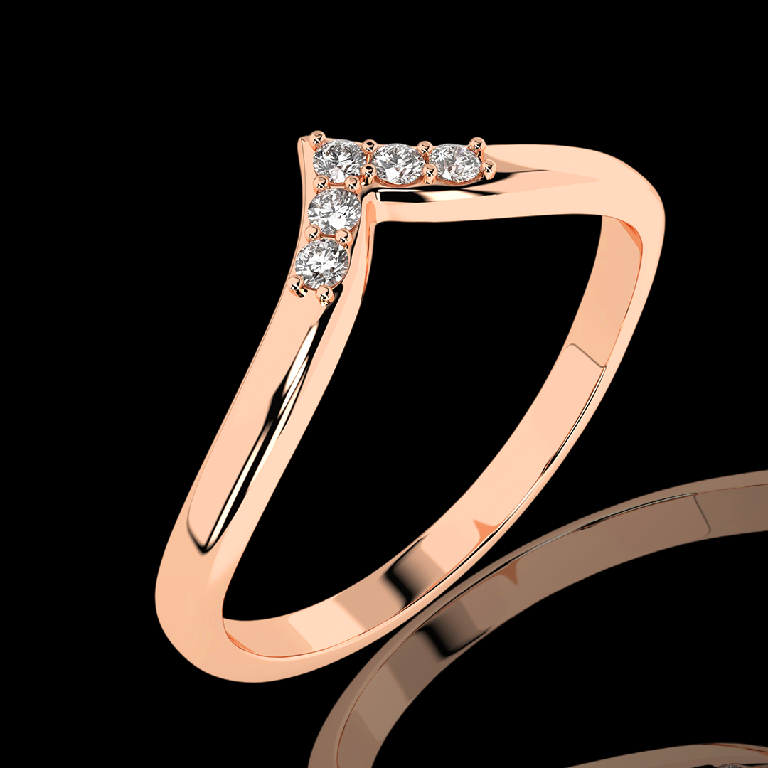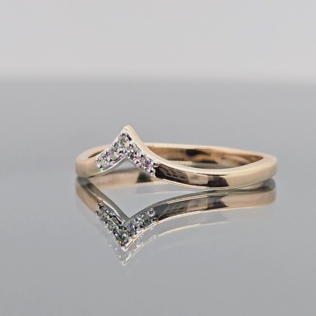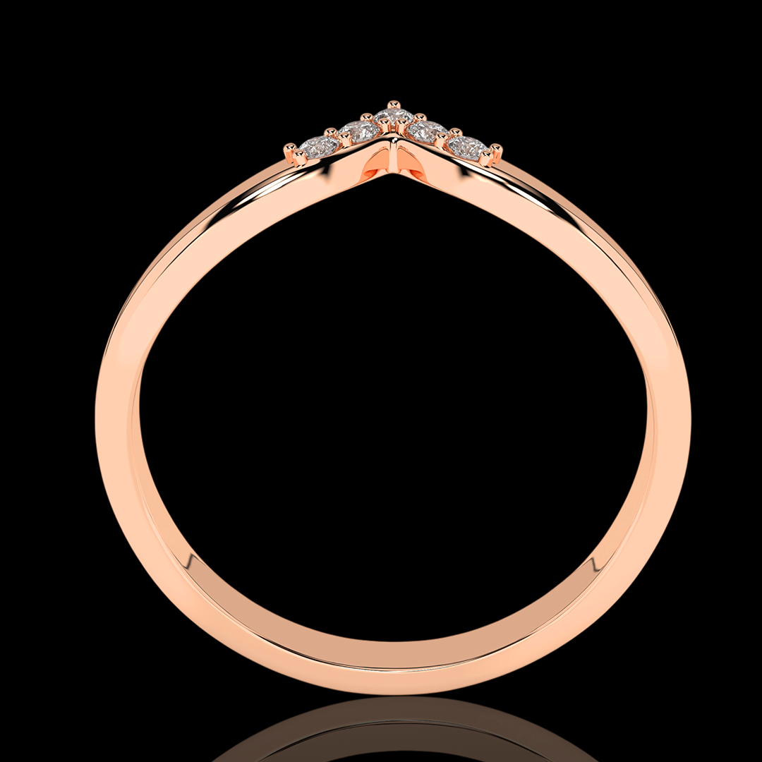 Šis raudono aukso žiedas su deimantais spindi subtilia elegancija ir šiuolaikišku dizainu. "V" formos lankelis, papuoštas mažais briliantais, išryškina žiedo modernumą. Jis gali būti dėvimas vienas arba derinamas su sužadėtuvių arba vestuviniais žiedais, suteikdamas deriniui originalumo.