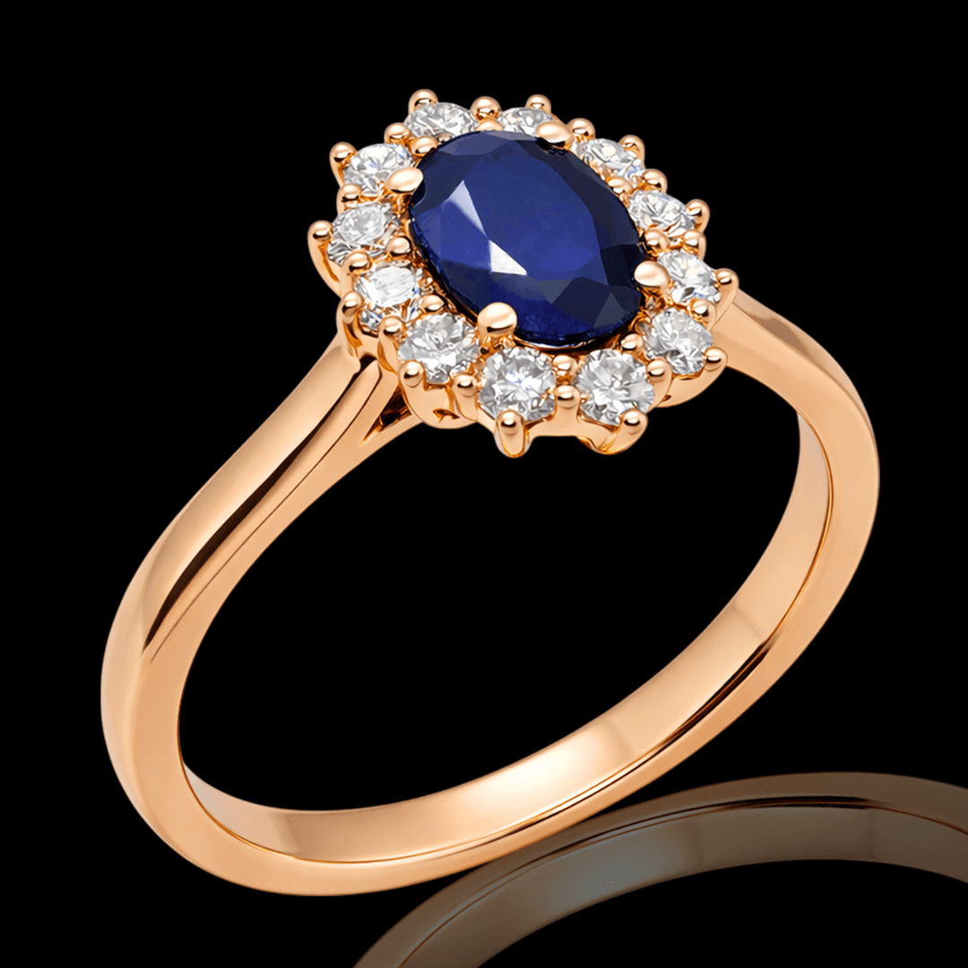 Safyras – ištikimos meilės ir vidinės ramybės simbolis, nuo seno siejamas su kilmingumu ir dvasine harmonija. Centrinį safyrą elegantiškai supa smulkūs deimantai, suteikiantys žiedui papildomo spindesio ir prabangos. Žiedą galime pagaminti Jums norimo dydžio ar aukso spalvos.