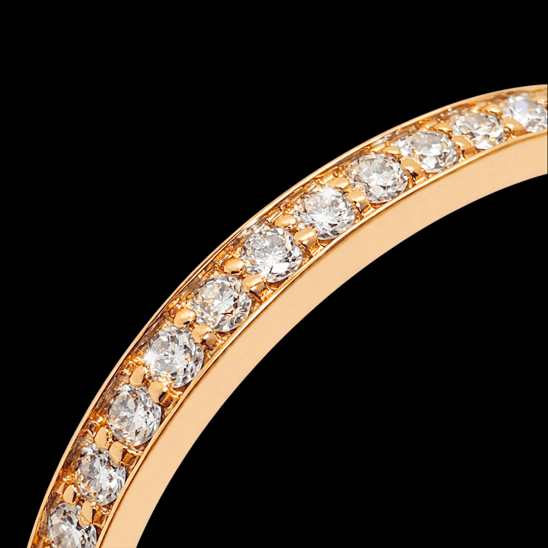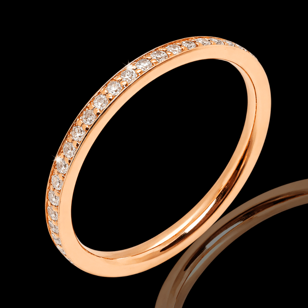 Raudono aukso žiedas su briliantais. Žiedą visu ratuku puošia 48 vienetai skaidrių briliantų. Šį žiedą galime pagaminti pagal jūsų norimą dydį ar aukso spalvą, dėl užsakymo susisiekite privačiai.