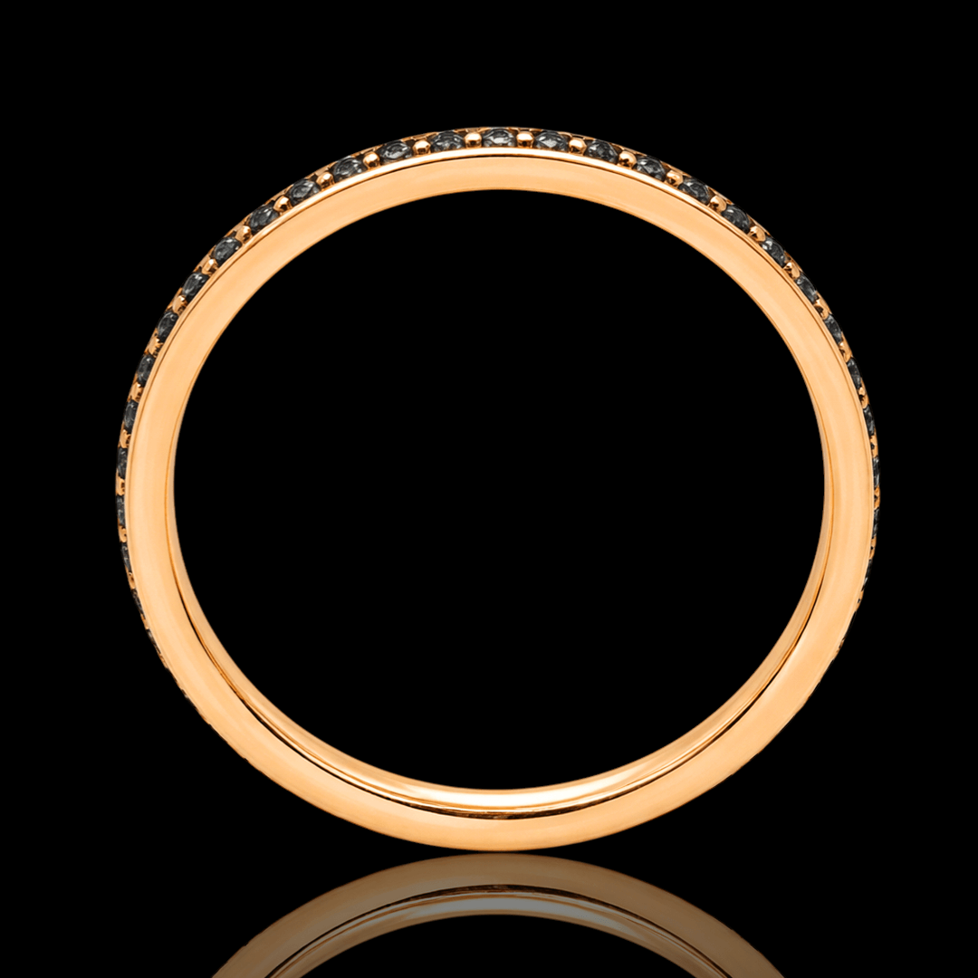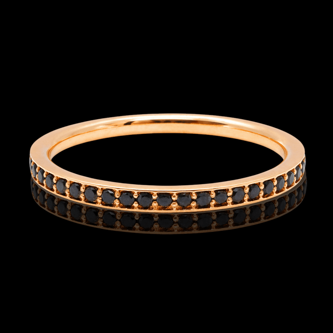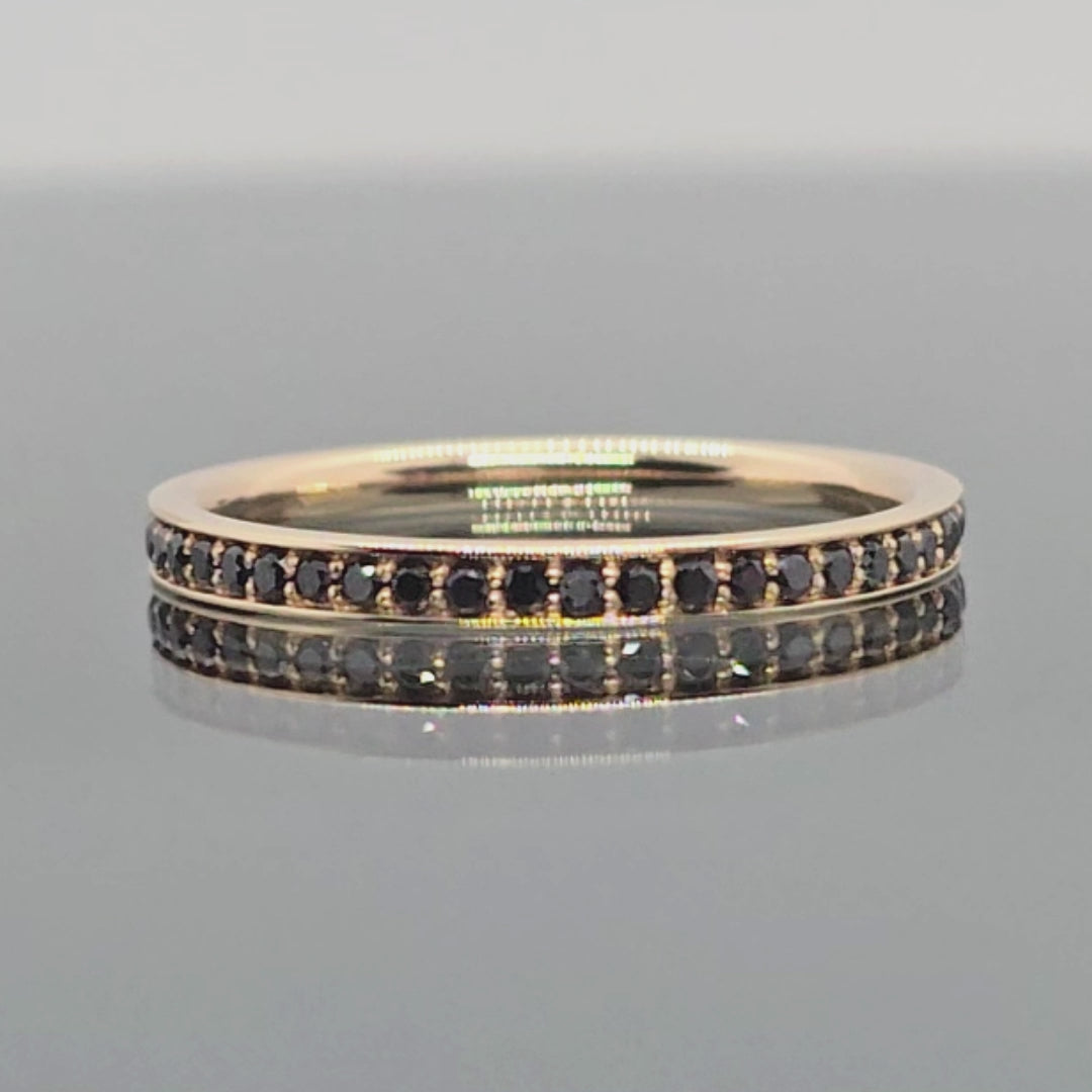 Raudono aukso žiedas su juodais deimantais. Žiedą visu ratuku puošia juodi deimantai. Šį žiedą galime pagaminti pagal jūsų norimą dydį ar aukso spalvą, dėl užsakymo susisiekite privačiai.