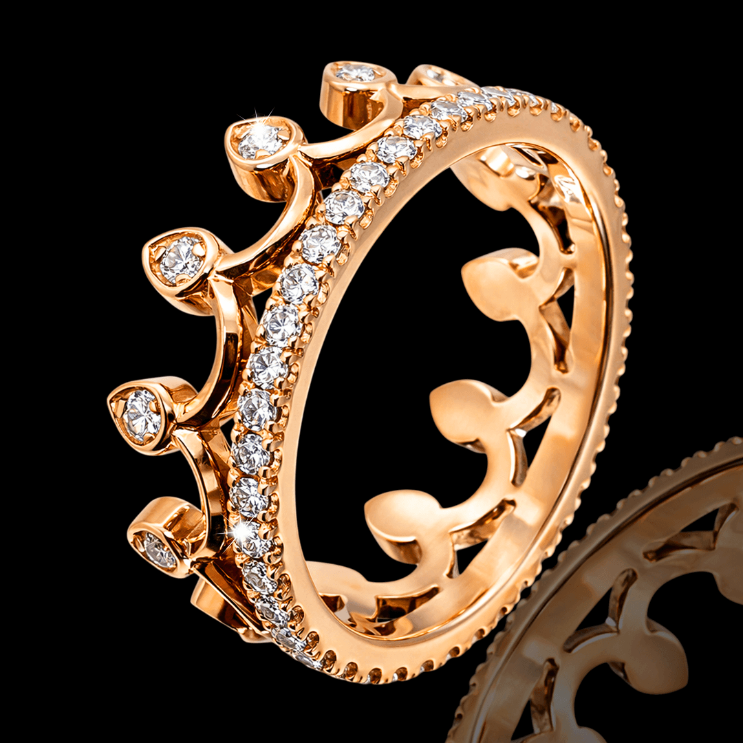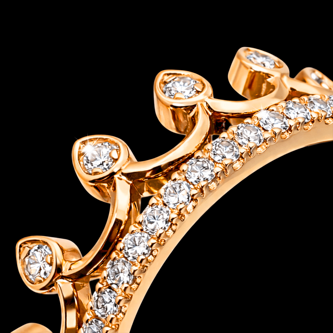 Karūnos formos raudono aukso žiedas papuoštas su briliantais. Šį žiedą puošia net 53 vienetai mažų briliantų. Toks briliantų skaičius leidžia šiai karūnai tiesiog žibėti. Šio žiedo dydis yra 17.2mm. Jei norimas kitas žiedo dydis ar aukso spalva, galite su mumis susisiekti.